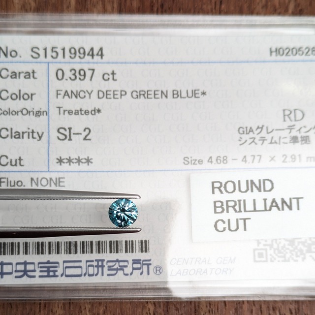 【DiamondAntique】をご覧いただきましてありがとうございます。 トリートブルー ダイヤルースのご紹介です。 重量(Weight):0.536ct サイズ(measurement):5.39-5.41×3.06mm 付属品:FANCY DEEP GREEN BLUE(Treated) I1 ROUND BRILLIANT CUT 中宝研ソーティング 品番:PRO208222 ☆ひとこと☆ 何よりも、このサイズ感を見てください!!ともすると、脇石やシークレット・ストーンに落ち着きがちなトリートカラーのダイヤモンド。人為的に色を付けているものになりますが、その性質は不可逆的で、かなり印象的な美しさを楽しめます。もう今回は難しいことを考えず、ダイヤモンドの輝きと色の鮮やかさを楽しんでください!内包された虹色に煌めくフェザーは、あなたとこの石をつなぐ美しい架け橋。ファースト・ダイヤモンドとしても面白いですよ☆ 届きましてから気になる点がございましたらご連絡ください、出来る限り対応いたします。 ご購入後、できるだけ早く発送いたしますが、出張等で発送が遅れる場合がございます。ご了承ください。 ダイヤモンドに付属するソーティング袋は業者間取引に使用される簡易レポートですので、傷んでいる場合もございます。別途料金で鑑定書を作成する事も出来ますのでご検討ください。 鑑定書作成には少々お時間をいただきます。時期によって多少変わりますので、お急ぎの方はご相談ください。