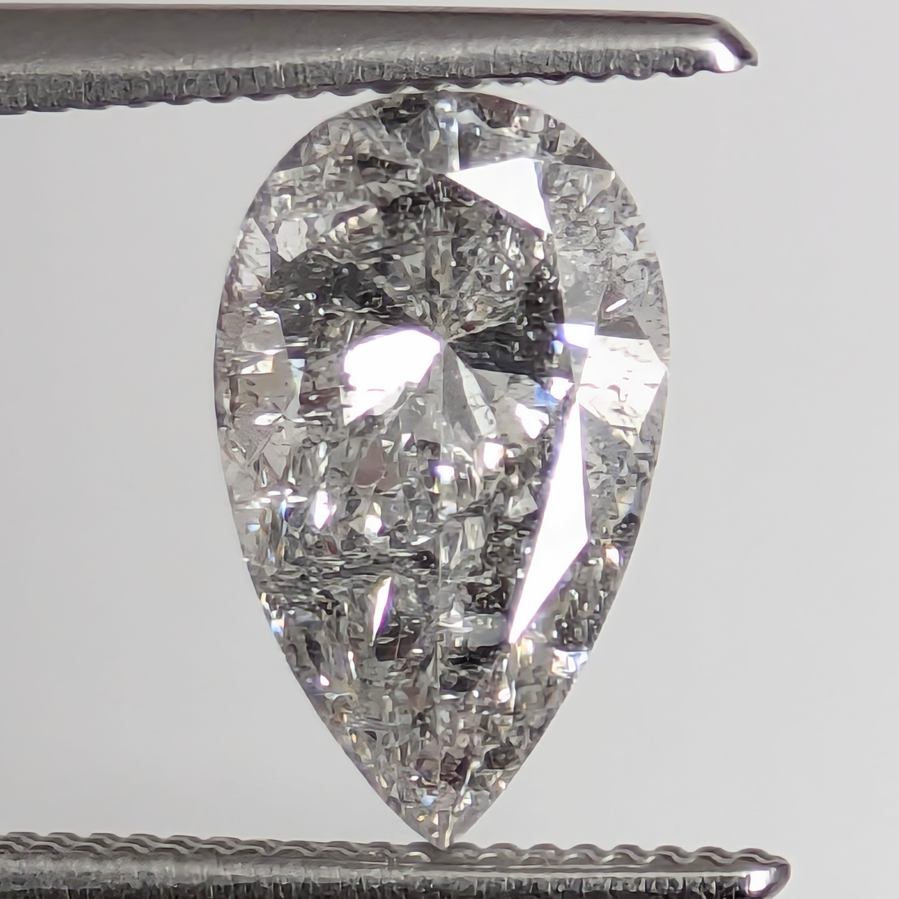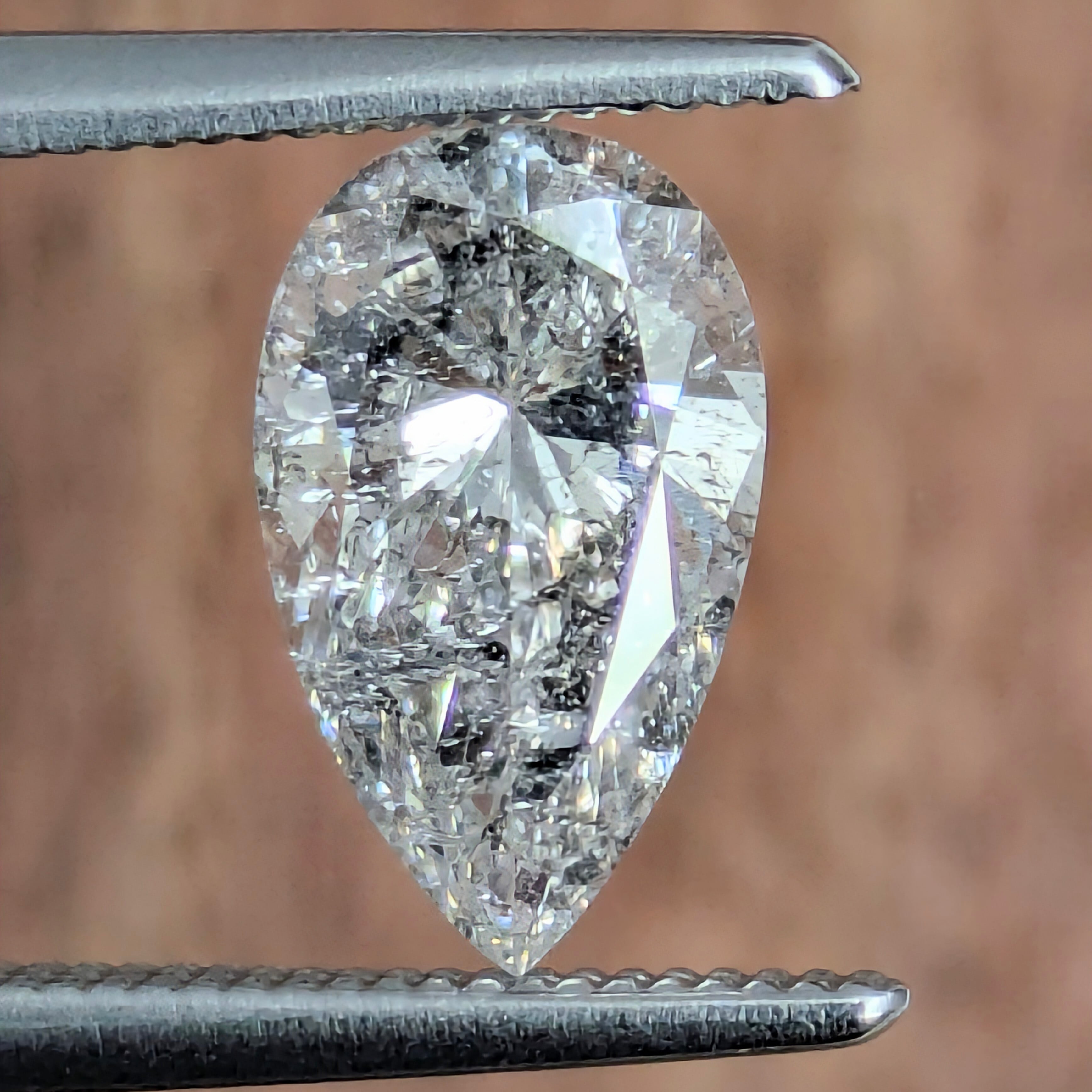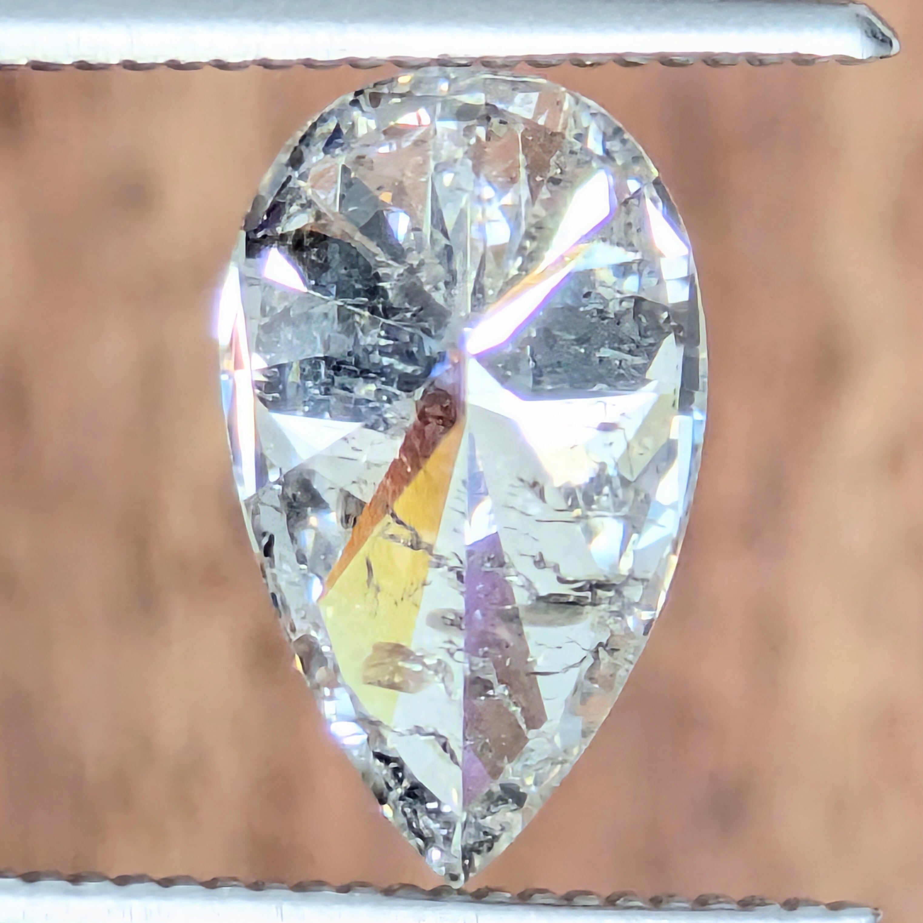 氷のように凍てついた輝きのダイヤモンドに流れる血液があるとすれば、きっとこのような鋼鉄色の液体であろう・・・と納得してしまうような、何とも美しいインクルージョン。種類としては「カーボンを伴うフェザー」インクルージョンだとは思うのですが、細かくうねうねと張り巡らされているその姿は、まるで血管のように脈動を感じるかのようです。でも、しっかりと“テリ”と“輝き”を持った1ピース。大粒狙いの方には、お値打ちだと思います☆