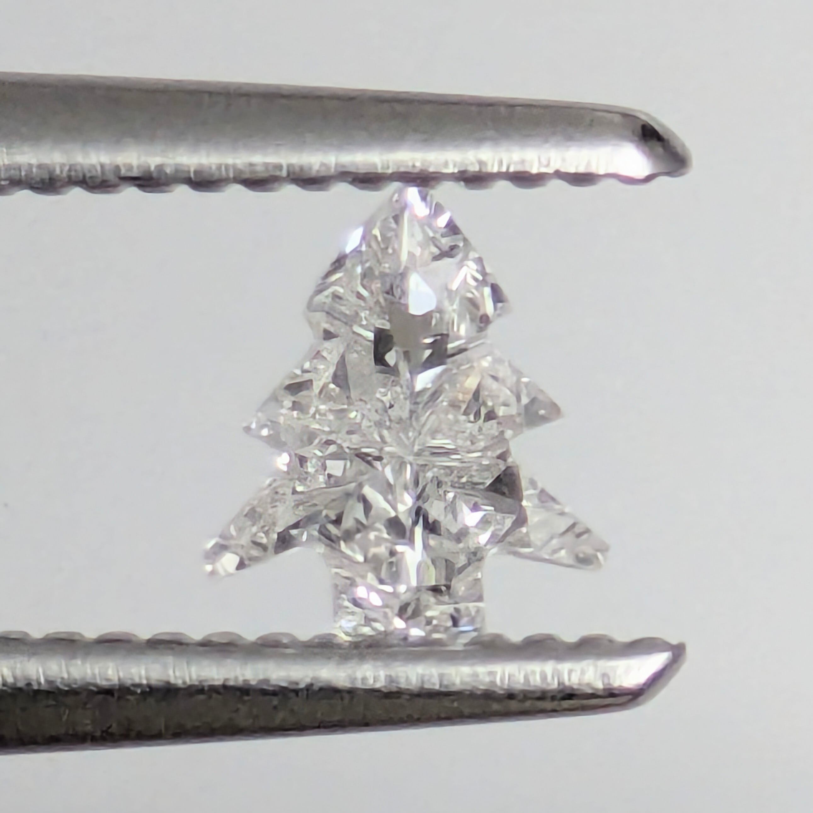 当店の品番「PRO207826」のダイヤモンドよりもわずかに小さめの、背丈が低めのクリスマスツリーがモチーフのダイヤモンド。わずかにちょっとずんぐりとしたその形は、朝陽に照らされた新雪の煌めきをこんもりとまとった“もみの木”そのもののようで、小粒ではありますがキラキラと輝きが美しい1ピースです。肉眼でもしっかりと確認できるその形は、遠い追憶の、色褪せない幸せなクリスマスの日を優しく思い出させてくれます。