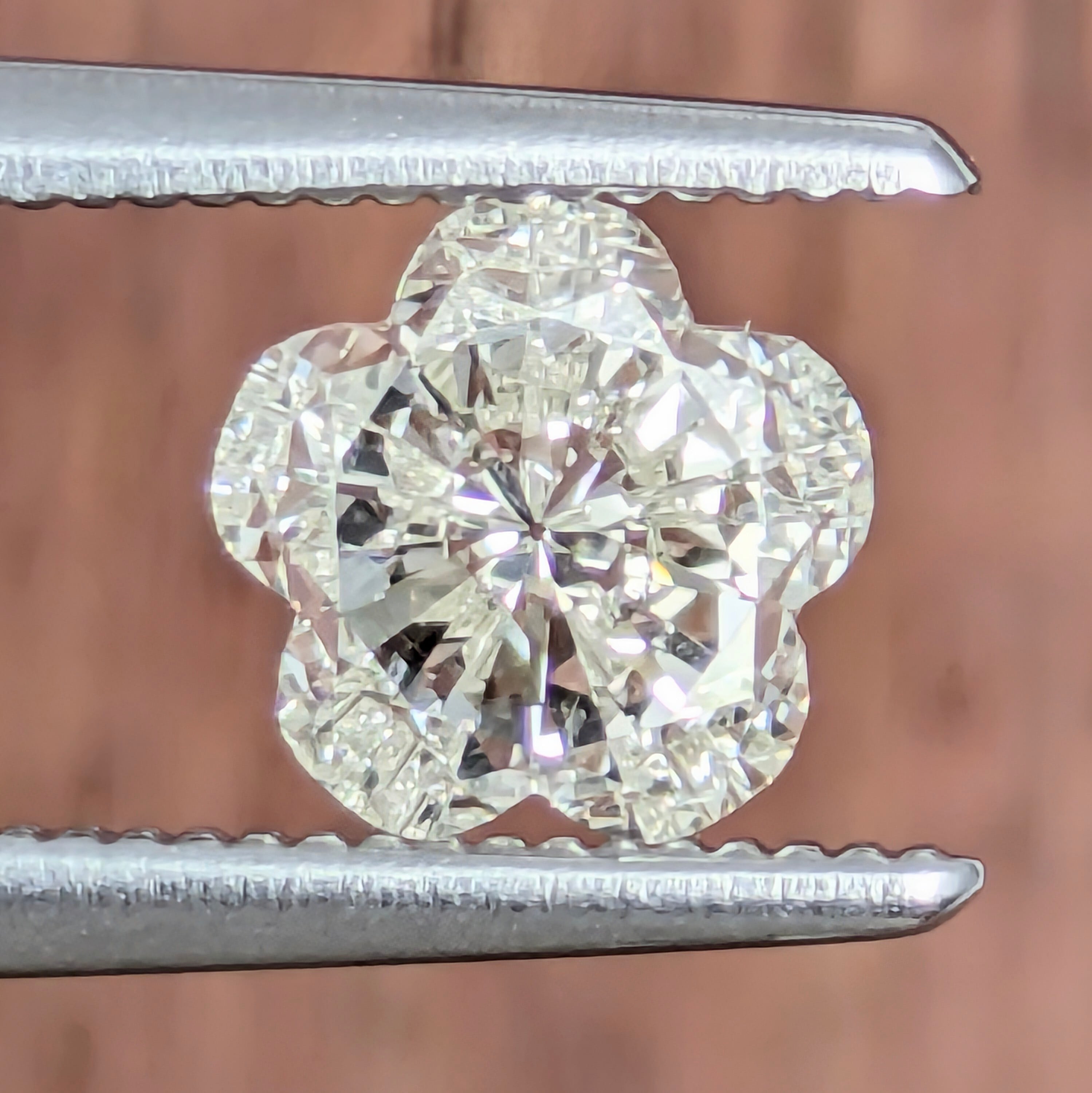 当店の商品番号「PRO207828」のフラワー型ダイヤモンドとペア組のできる1ピースです。浅めの花弁の彫りが「梅の花」を思わせる、とってもキュートな1ピース。梅の花の煌めきは、これから芽吹く春の花々の先陣を切って「生命の輝き」を放つ特別な美しさ。わずかに含まれるインクルージョンも(肉眼では見えないレベル)、花々に欠かせないおしべ、めしべのようで味わいがあります。