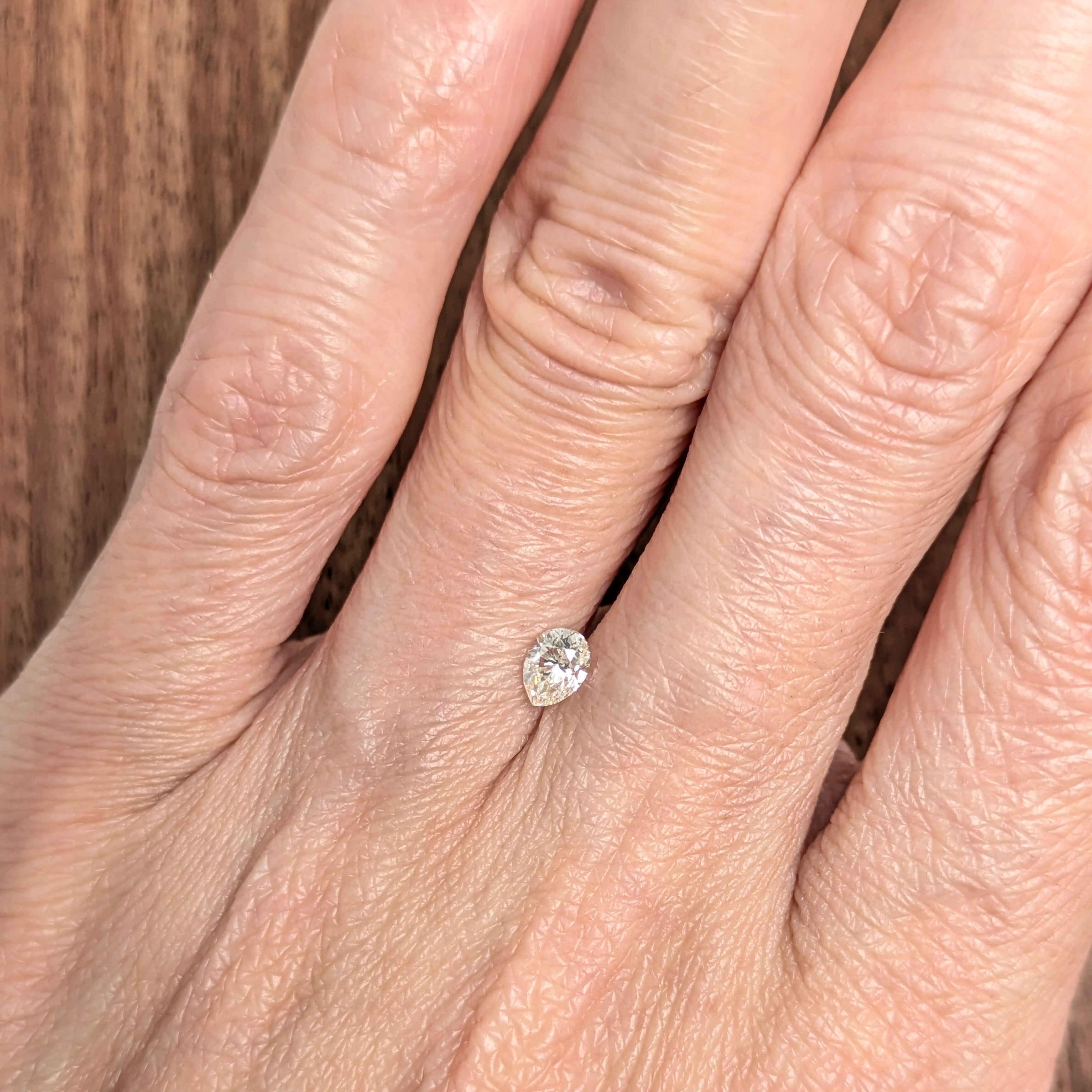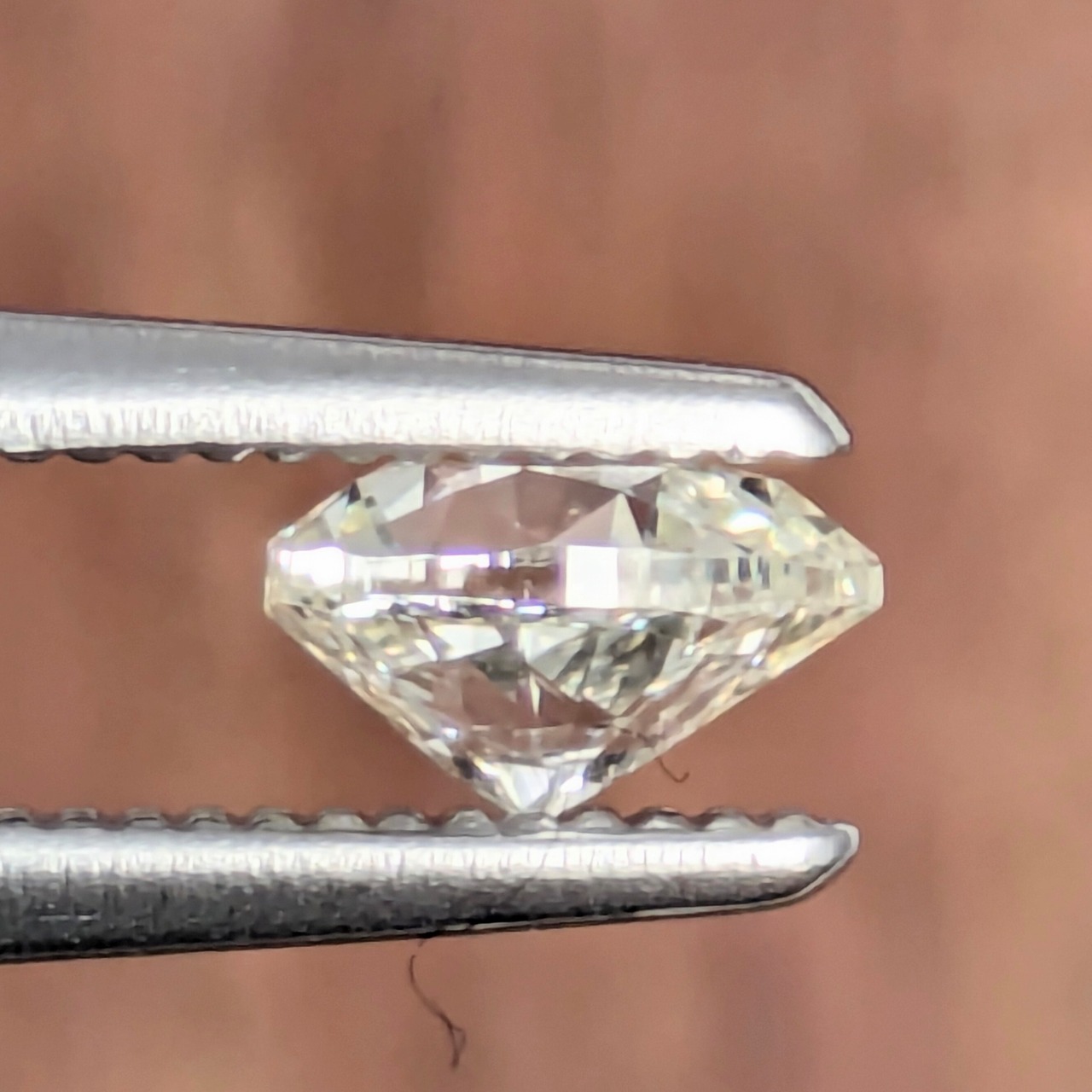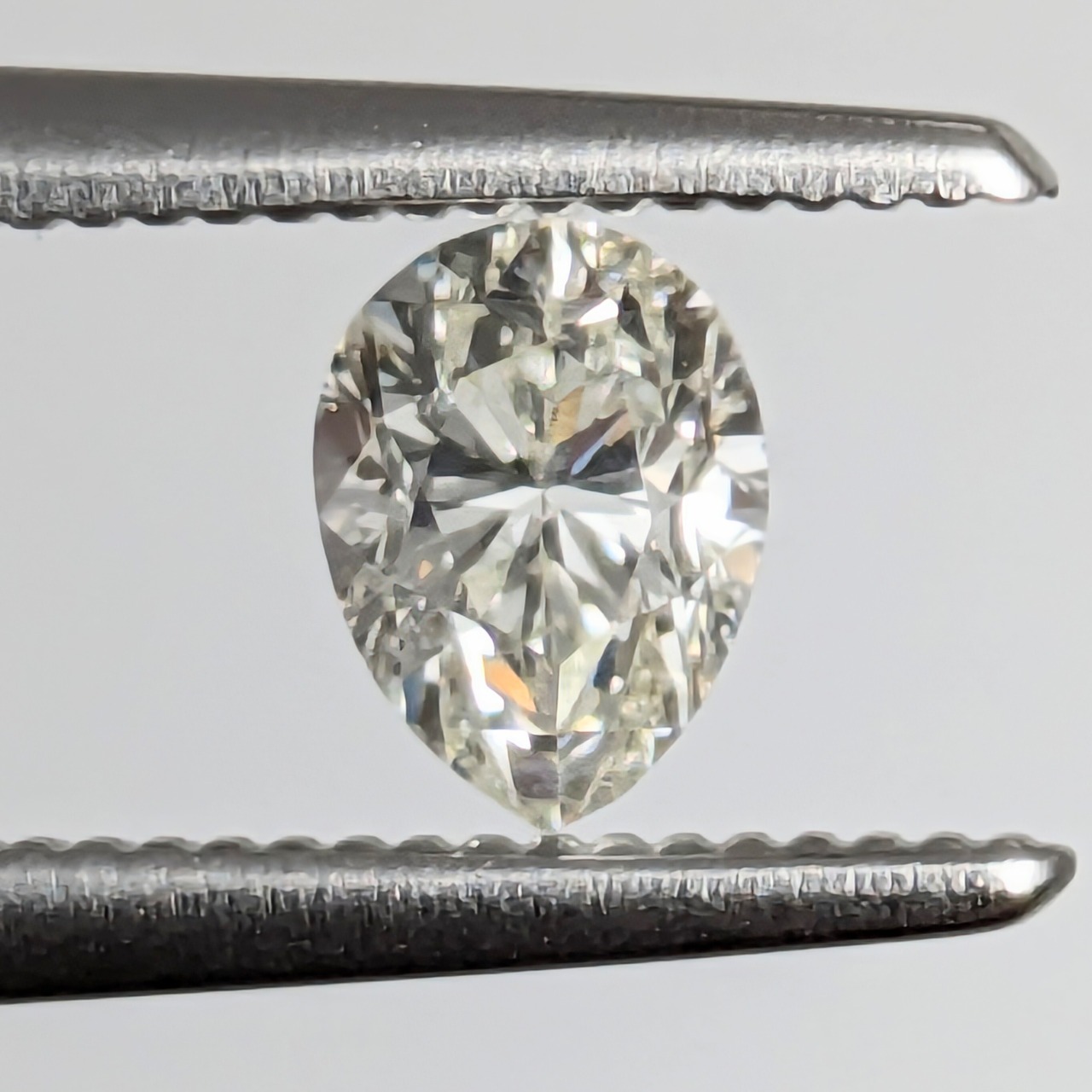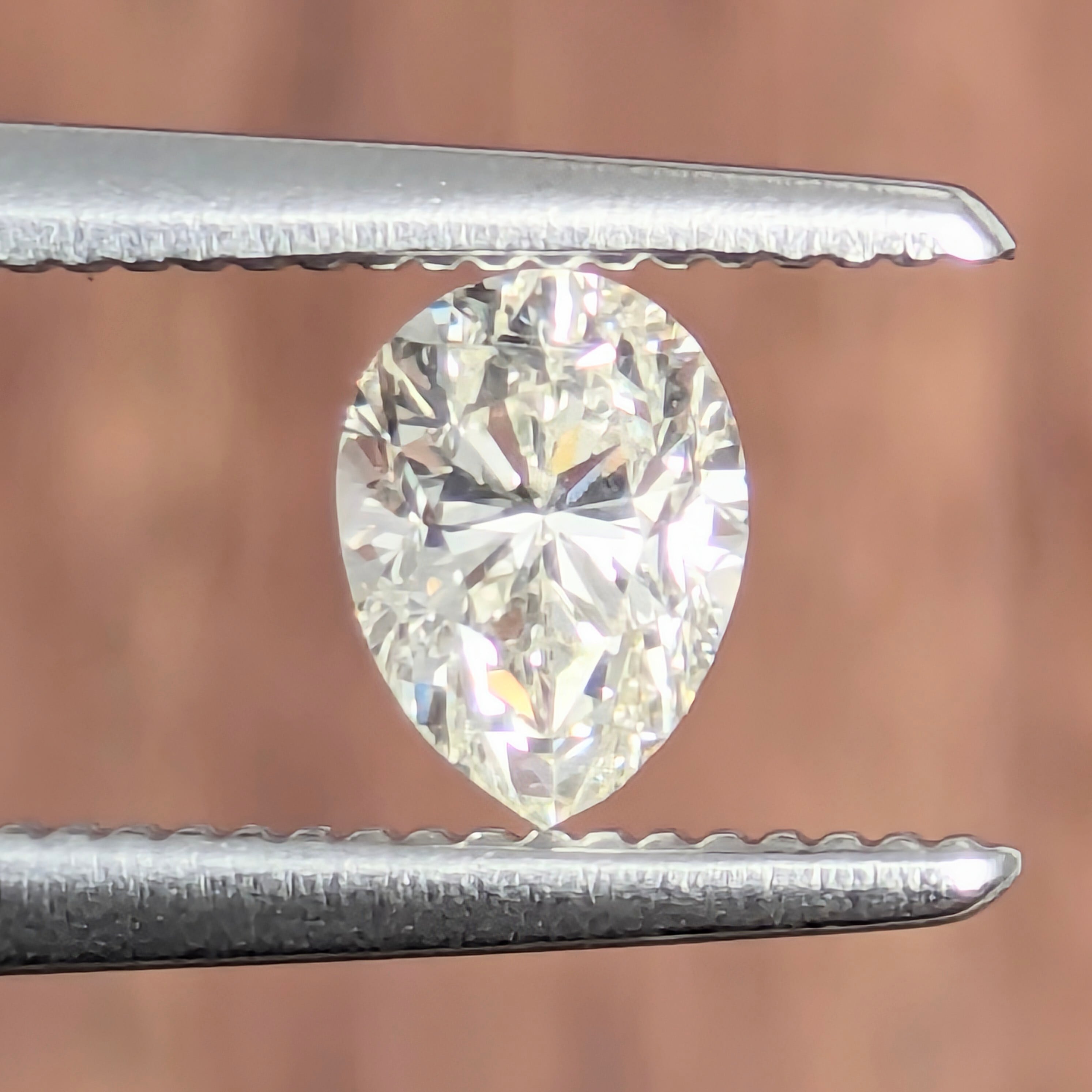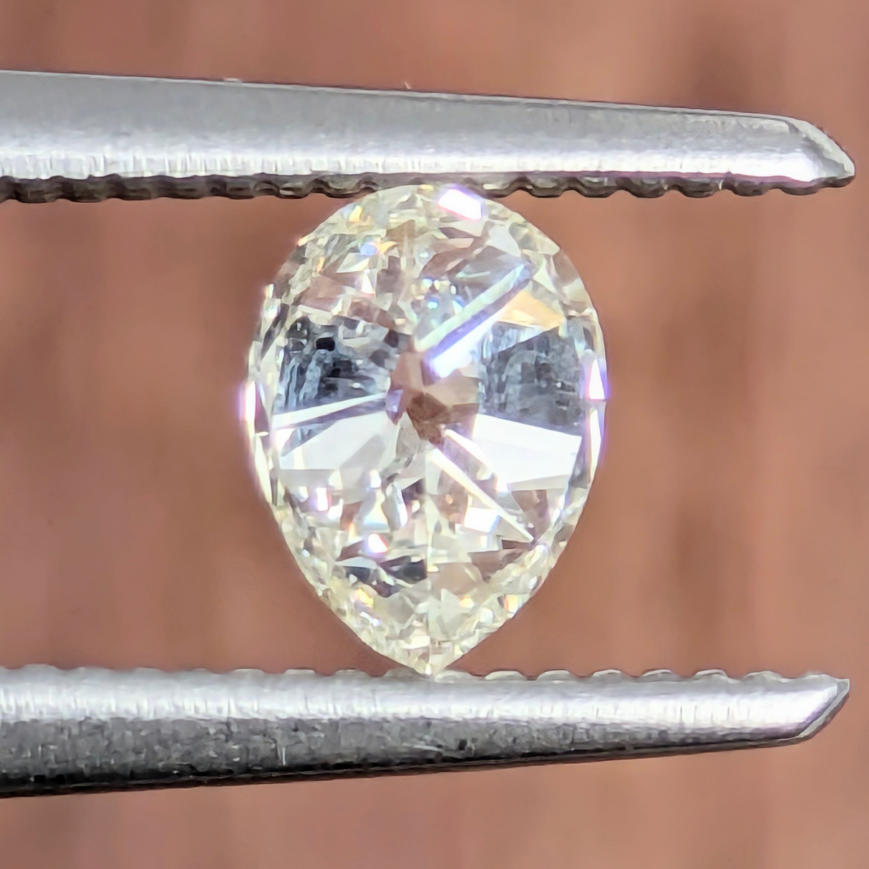 縦横比、丸みの部分、かなり理想的なシェイプをしたダイヤモンドです。「SI-1」だからと言って、ご心配はいりません。スターファセットの部分にごく短く、透明系のフェザーが入っていますが、非常に輝きが強いので肉眼では全く見えません。なおかつ、通常だったら若干イエロー味を感じる“Kカラー”も、その色が強い輝きで飛ばされてほとんど気になりません。第一印象として、このペアシェイプの美しさと、輝きの美しさに目を奪われる1ピースです。