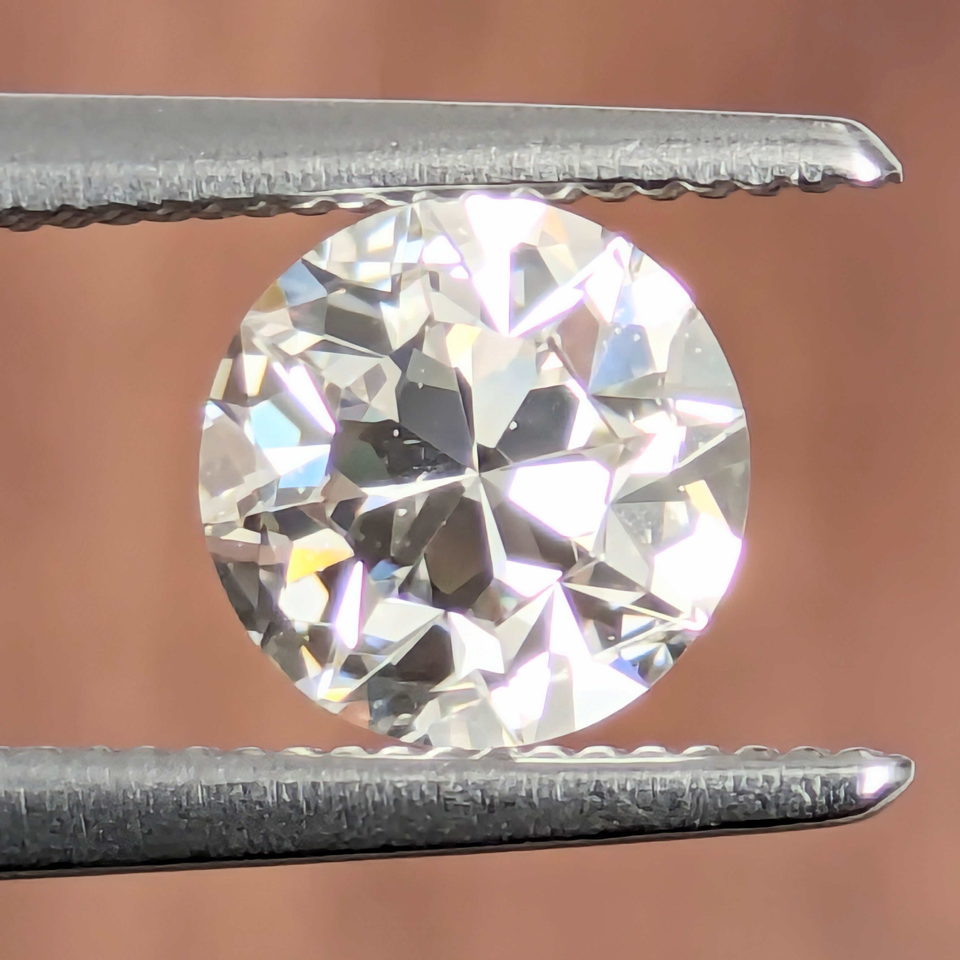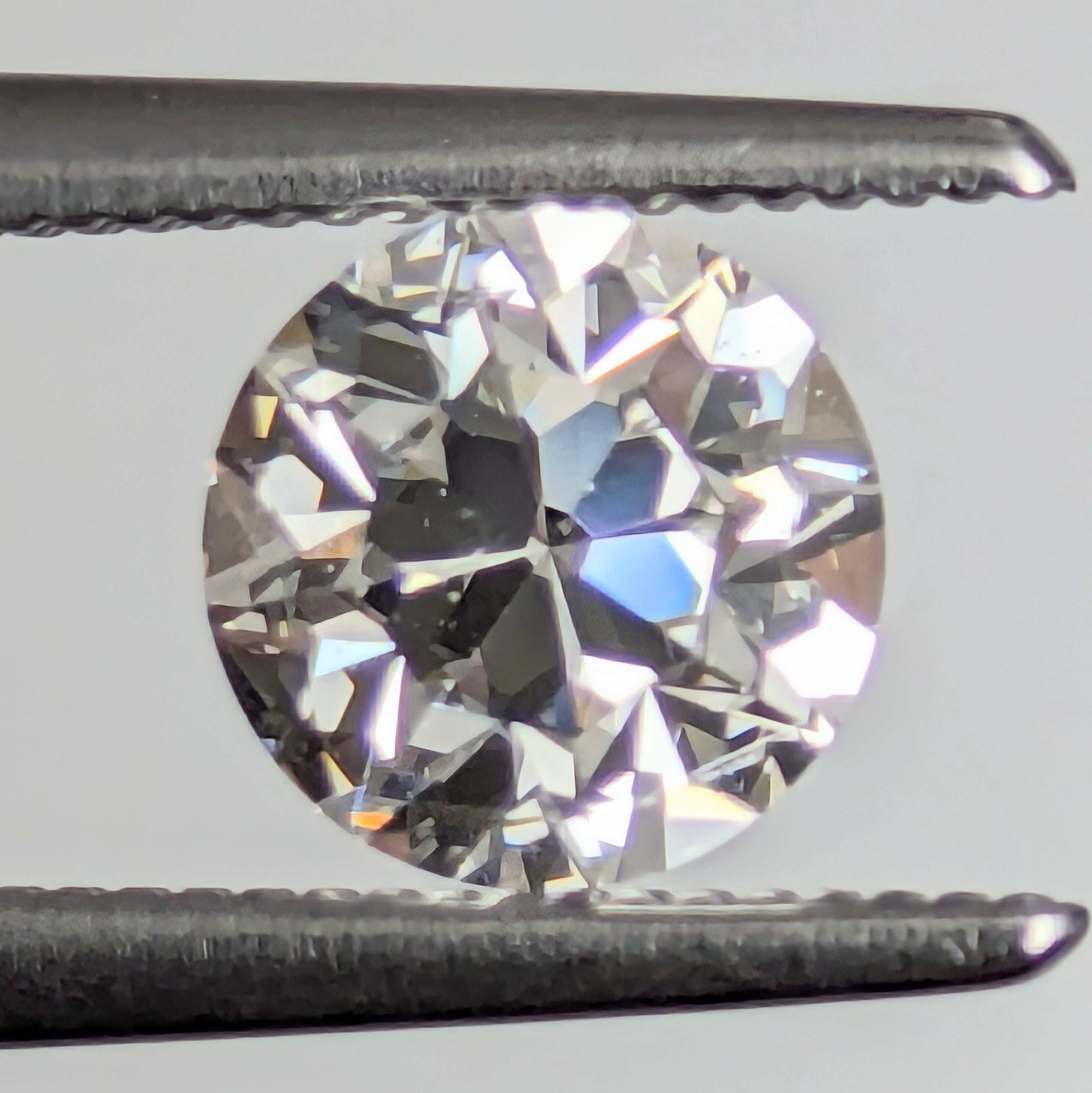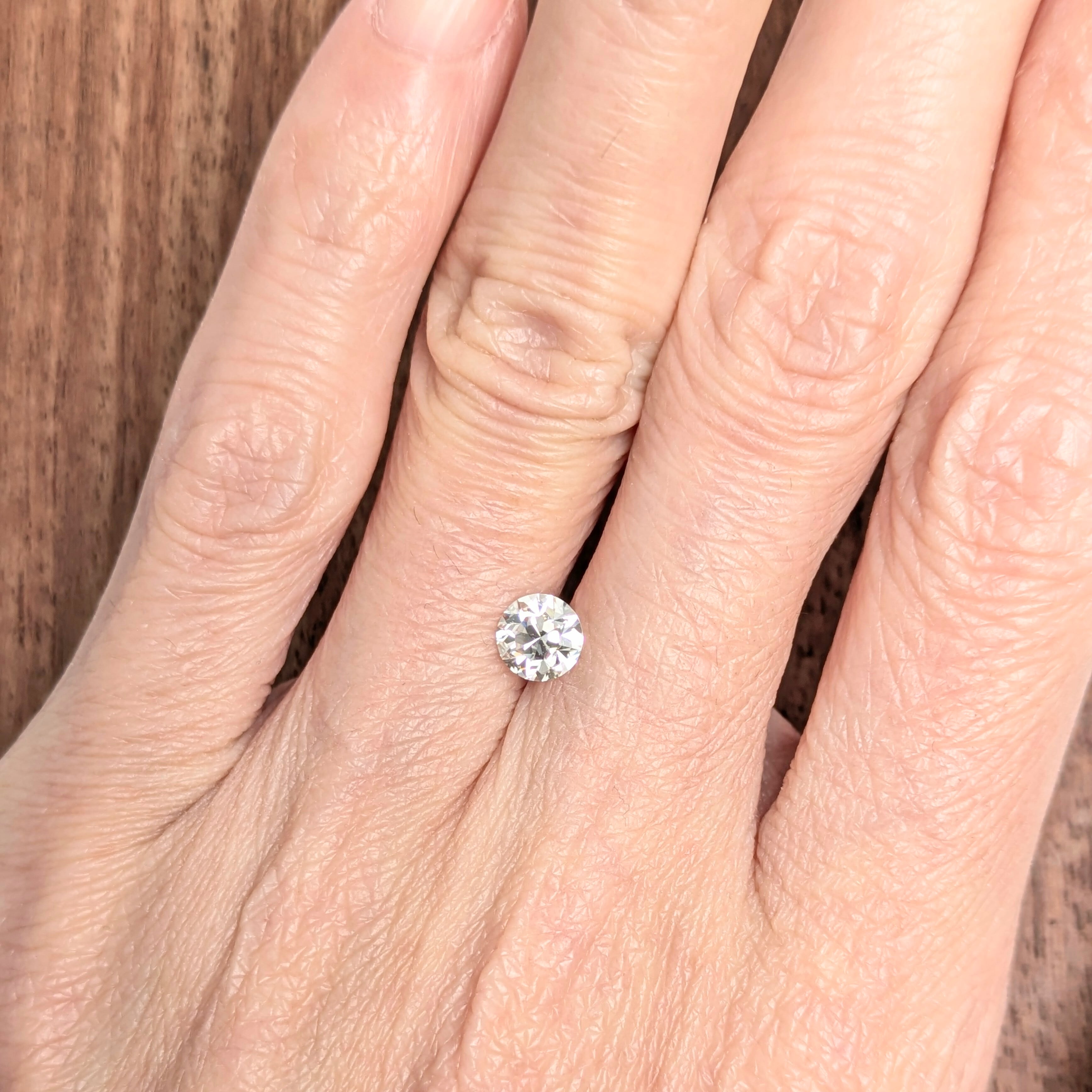 変形のカット面が連なった、輝きの強いダイヤモンド。ちょっと変わり種のラウンドモディファイドブリリアントカットの1ピースです。ひとたびルーペでその内部を覗くと通常よりも鋭角なカット面が印象に残ります。インクルージョンは無色系の小さな結晶がわずかに見られますが、輝きを妨げるようなものではありません。印象として、白い輝きのシンチレーションが記憶に残る、美しい1ピースです。