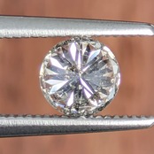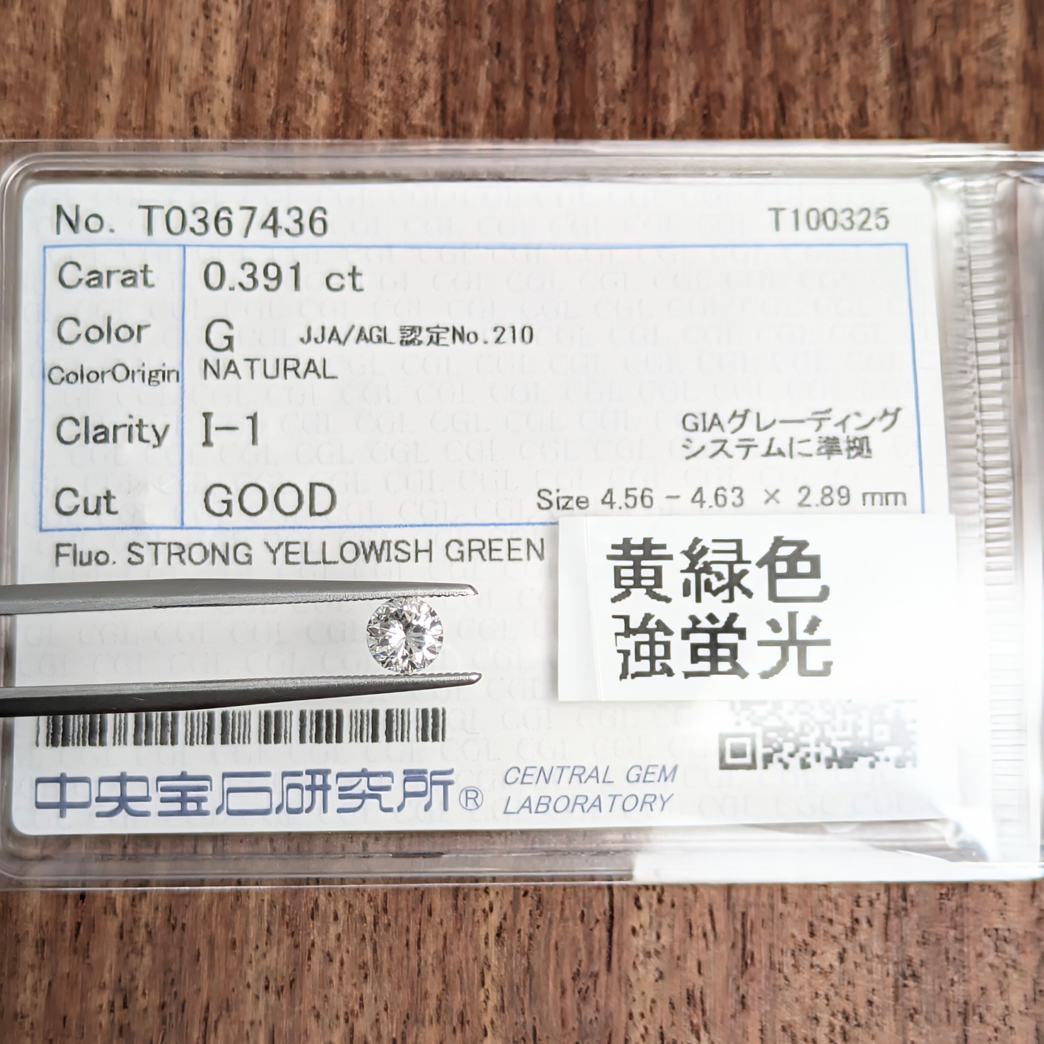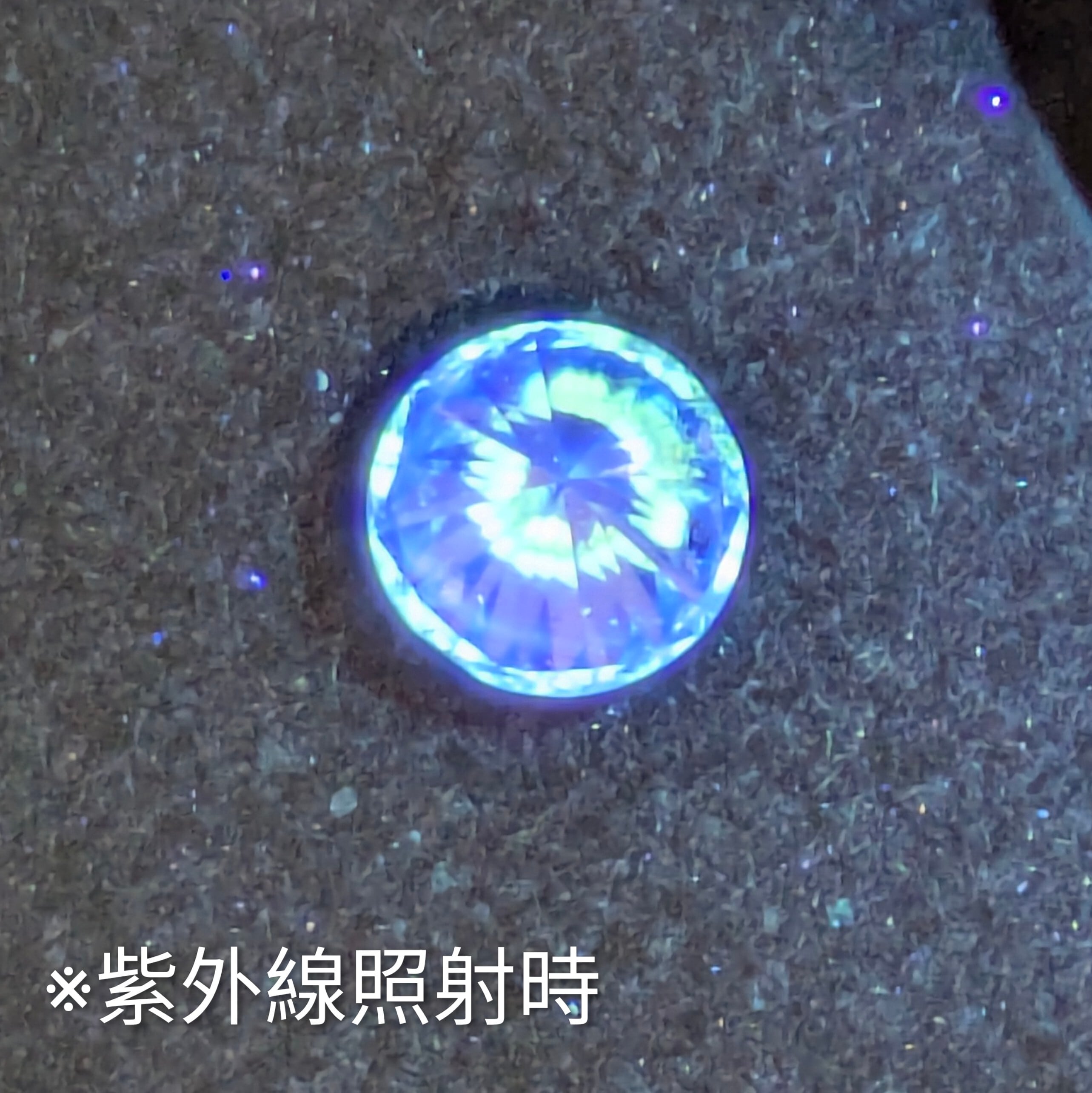 I-1ですが、肉眼での輝きは強い1ピース。インクルージョンはテーブルからベゼルにかけてカーボンが若干入っておりますが、肉眼で輝きをそこまで妨げるようなものではありません。そしてこちらのダイヤモンドのウリは、何といっても「強い蛍光性」。通常は蛍光性が発せられるときはその石は「白濁光」を発しているような印象がありますが、こちらのダイヤモンドは蛍光時に透明感があるのが印象的。「フェイスダウン」でご覧いただくと、よりその透明感のある発光に目を奪われます。