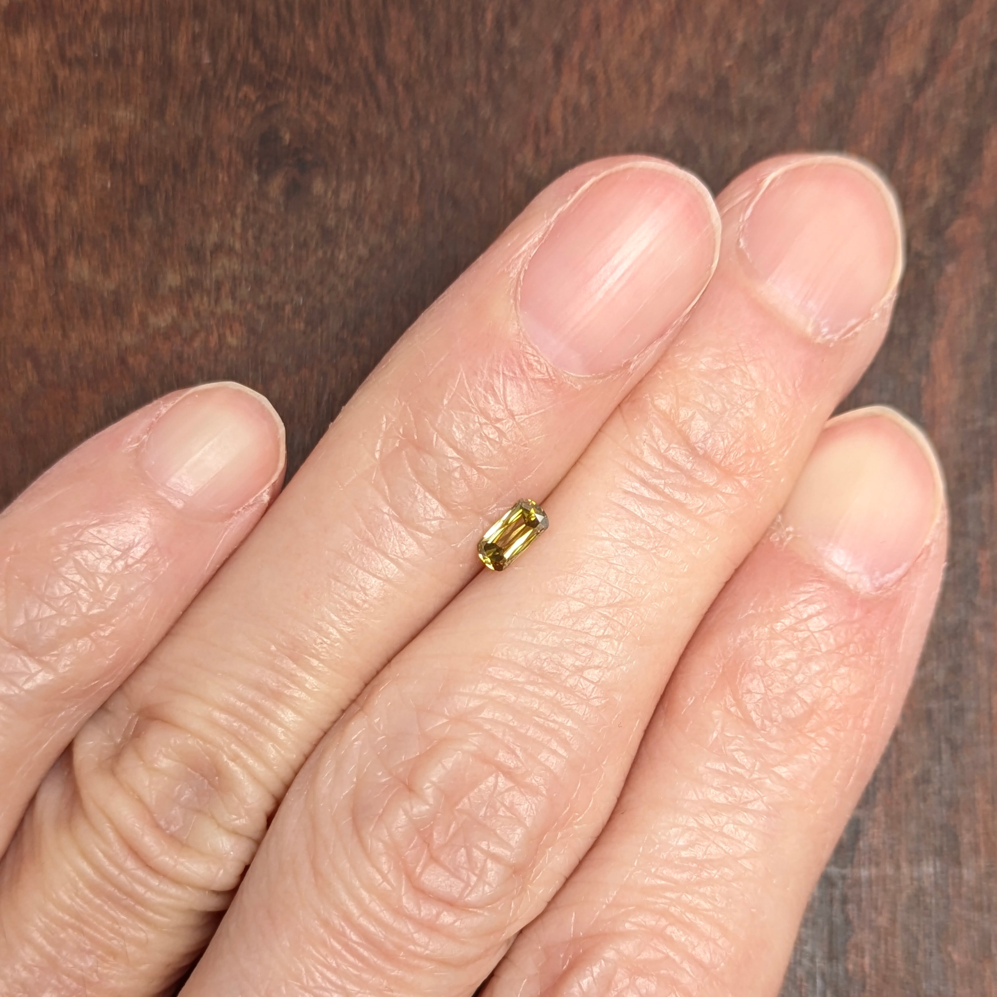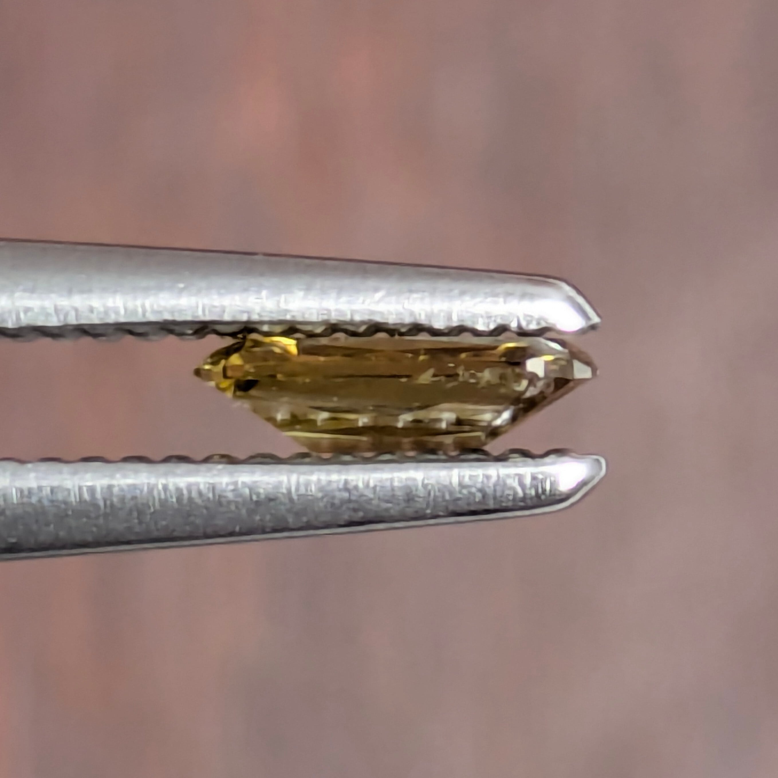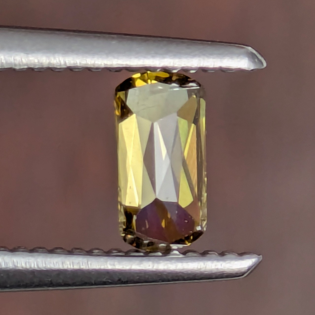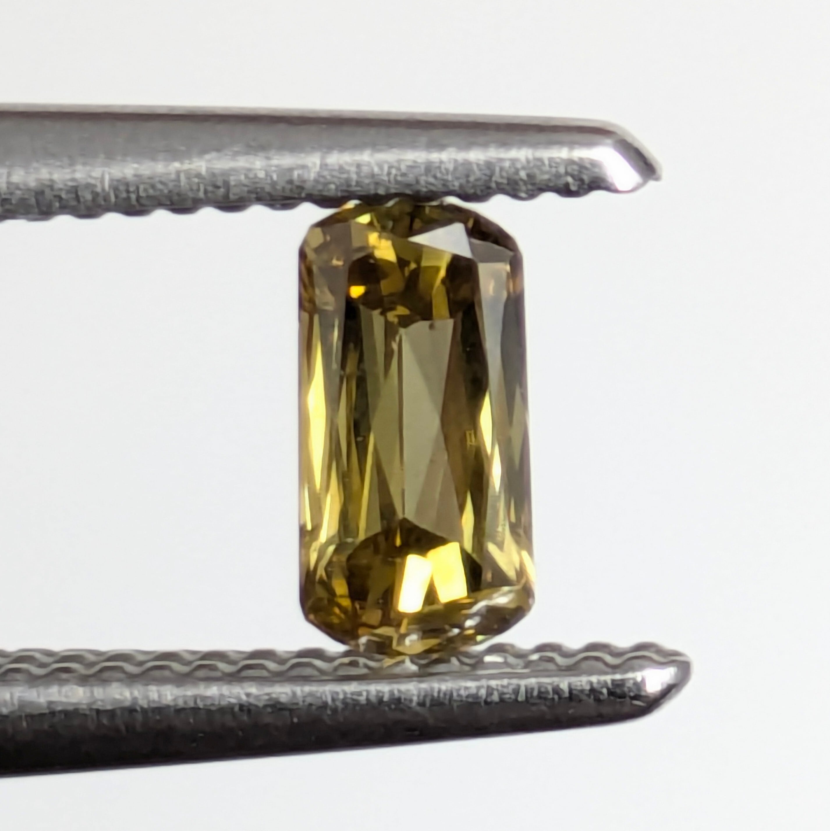 ブラウン、グリーン、イエローが複雑に絡み合わさった色合いも魅力的ですが、何よりも目を惹かれたのが独特のカットから生み出される輝き。クッションカットとシザースカットが組み合わさったような曲線と直線の交互の重なりが、複雑な色の重なり合いと連動しているように引き立て合い、唯一無二の美しさを生み出しています。「SI-2」は全体に細かく散ったクラウド状のインクルージョンですが、この輝きとテリを妨げるようなものではありません。テリッテリの1ピースです。