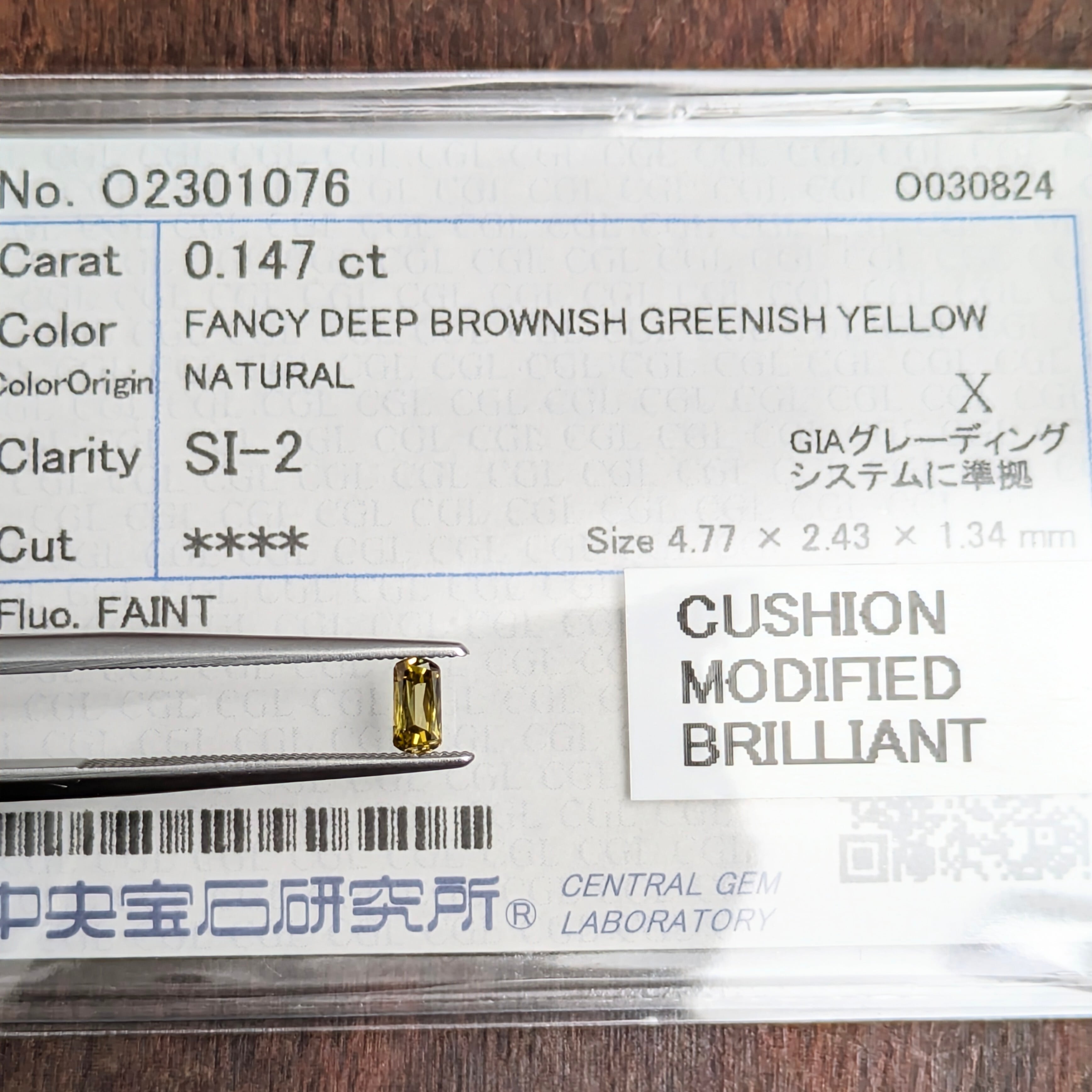 付属品:FANCY DEEP BROWNISH GREENISH YELLOW SI2 CUSHION MODIFIED BRILLIANT 中宝研ソーティング