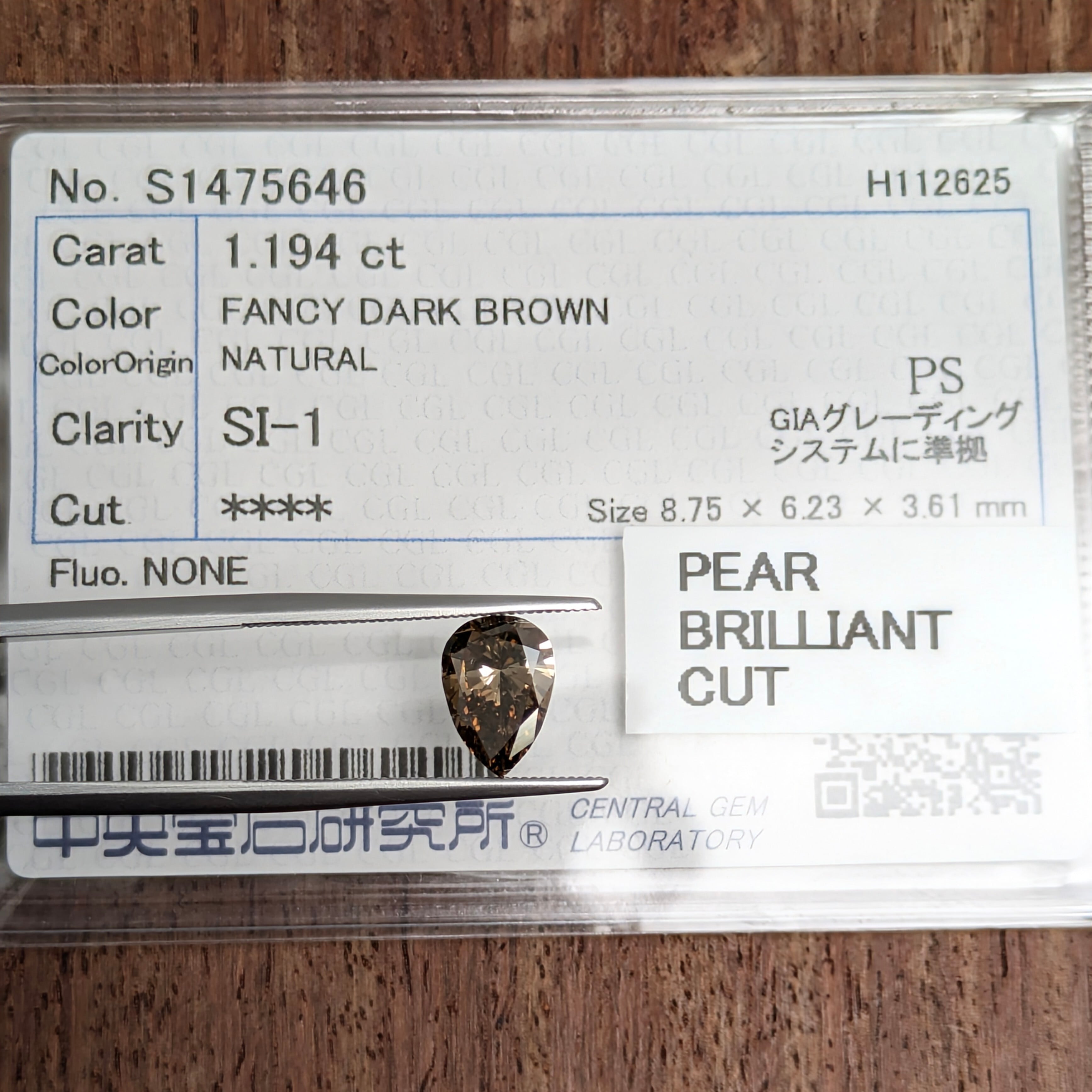 付属品:FANCY DARK BROWN SI1 PEAR BRILLIANT CUT 中宝研ソーティング