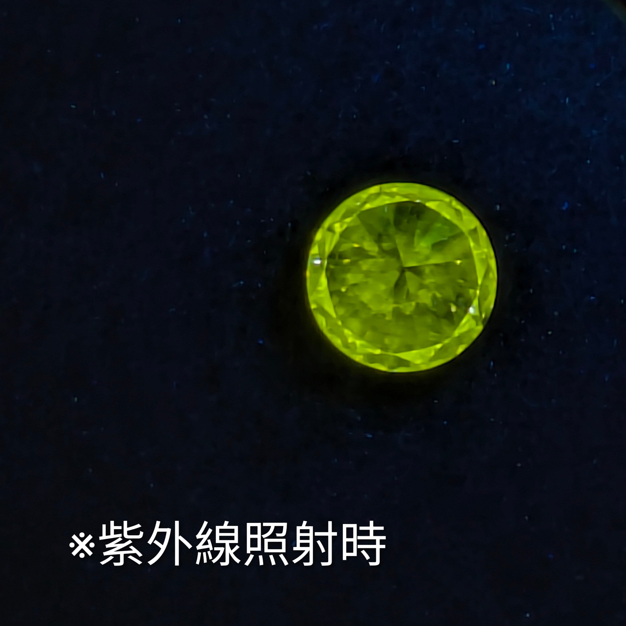 ご存知の方も多いと思いますが、ダイヤモンドの中にはブラックライトのような紫外線に当たると「発光する」ものが稀にあります。その中でも珍しいのは、まるでそこに恒星が輝いているかのように眩く光を発する「STRONG」や「VERY STRONG」という強い蛍光性をもつダイヤモンド。その中でも今回は、非常に珍しい「STRONG YELLOW」のダイヤモンドです。カットも「EXCELLENT(エクセレント)」と通常時も眩く、とても面白い個性を持った1ピースです。