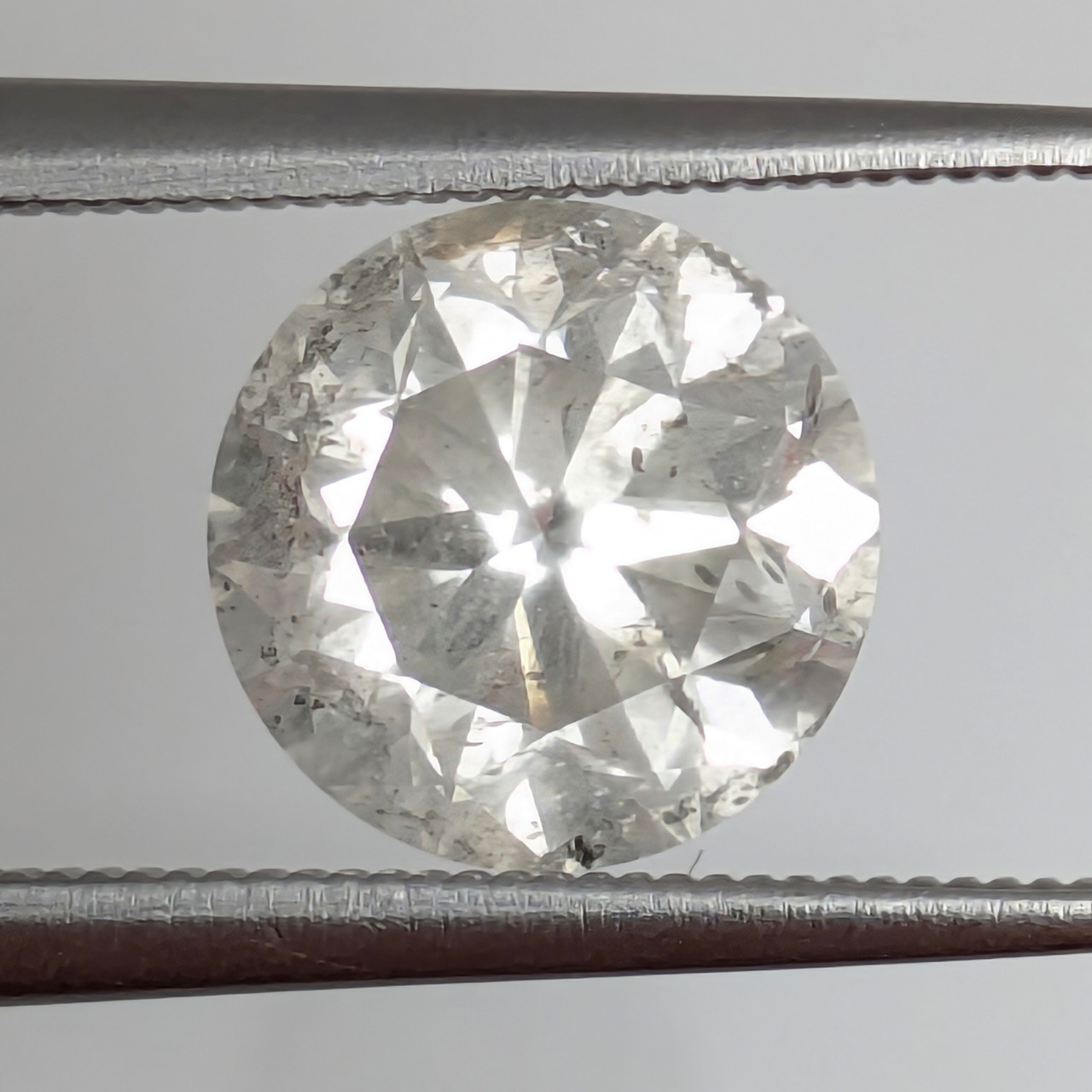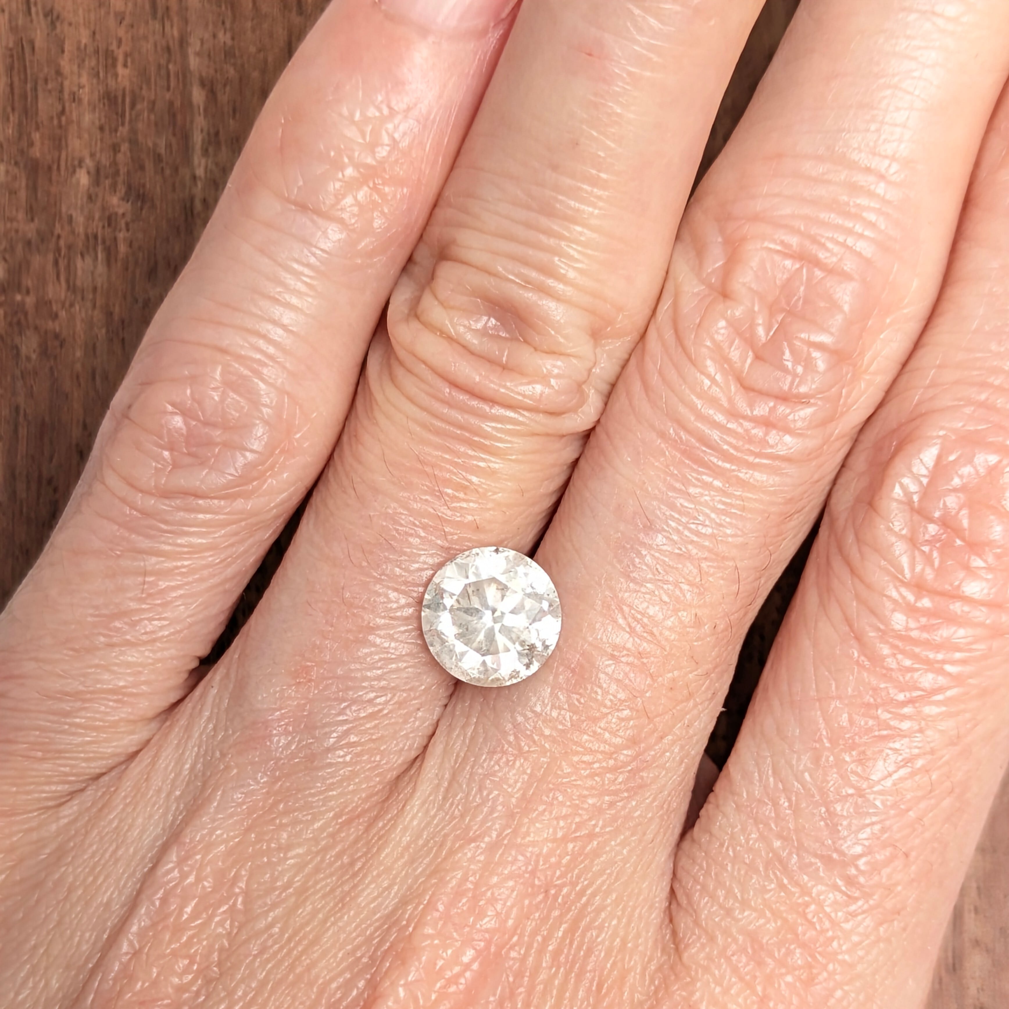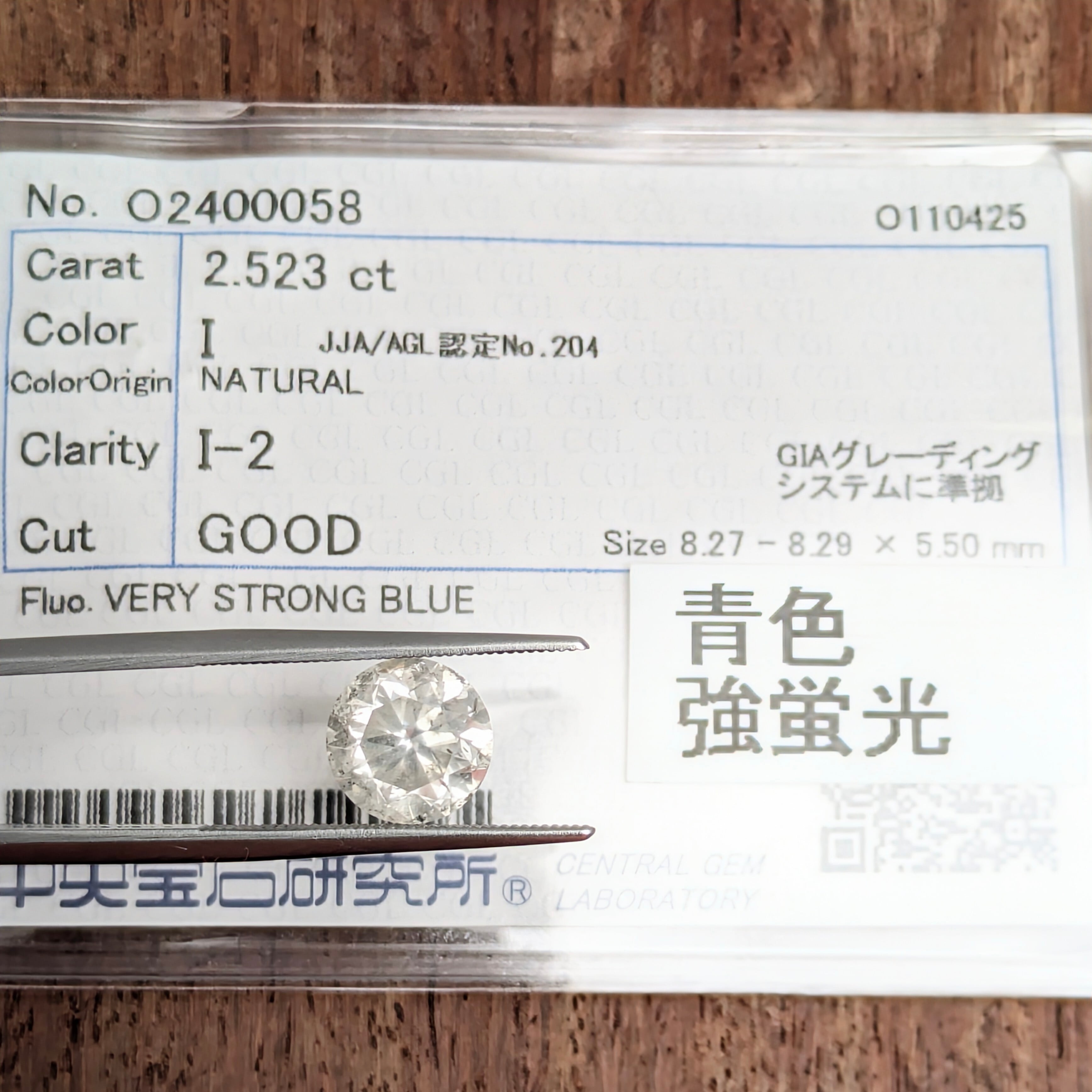 ご覧ください!このサイズ感・・・!2.523ct、I-2のダイヤモンドです。見た目は夢見るように霞がかかったような幻想的な輝き。ソルト&ペッパー系のダイヤモンドがお好きな方にとっては、『ソルト系』になると思います。「濁っているってこと?」と思ったそこの貴方・・・!ダイヤモンドを侮ってはなりません。シルキーな見た目の中に、吹雪の中、遠くから近づいてくる対向車の煌々と輝くヘッドライトのような、内側から滲み出る煌めきはやはりダイヤモンドならではの美しさです。