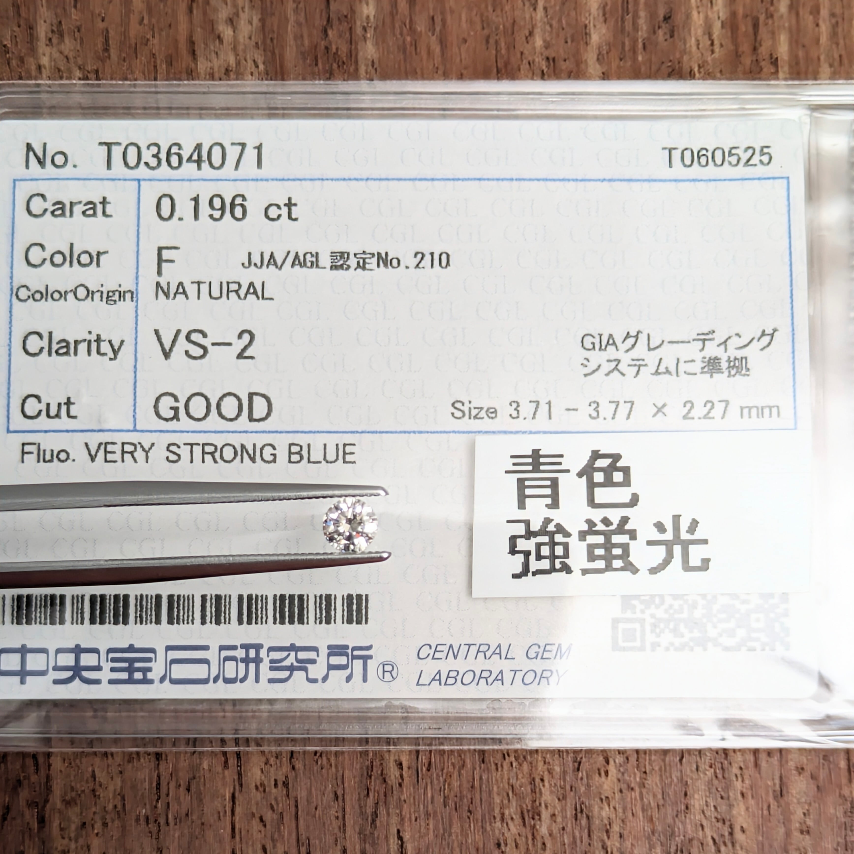 一見、「Fカラー」で「VS-2」という優等生な顔をしているようなピースですが、実はその内にかなり強烈な個性を隠し持ったダイヤモンド。蛍光性が「VERY STRONG BLUE」という、かなり弾けた個性を持っています。この『紫外線蛍光』というものは、強ければ強いほど(全部ではないですが)若干オイリー(テリが抑えられる現象)な姿になる可能性が出てきますが、こちらはスッキリと輝く、透明感も抜群の美しい1粒です。