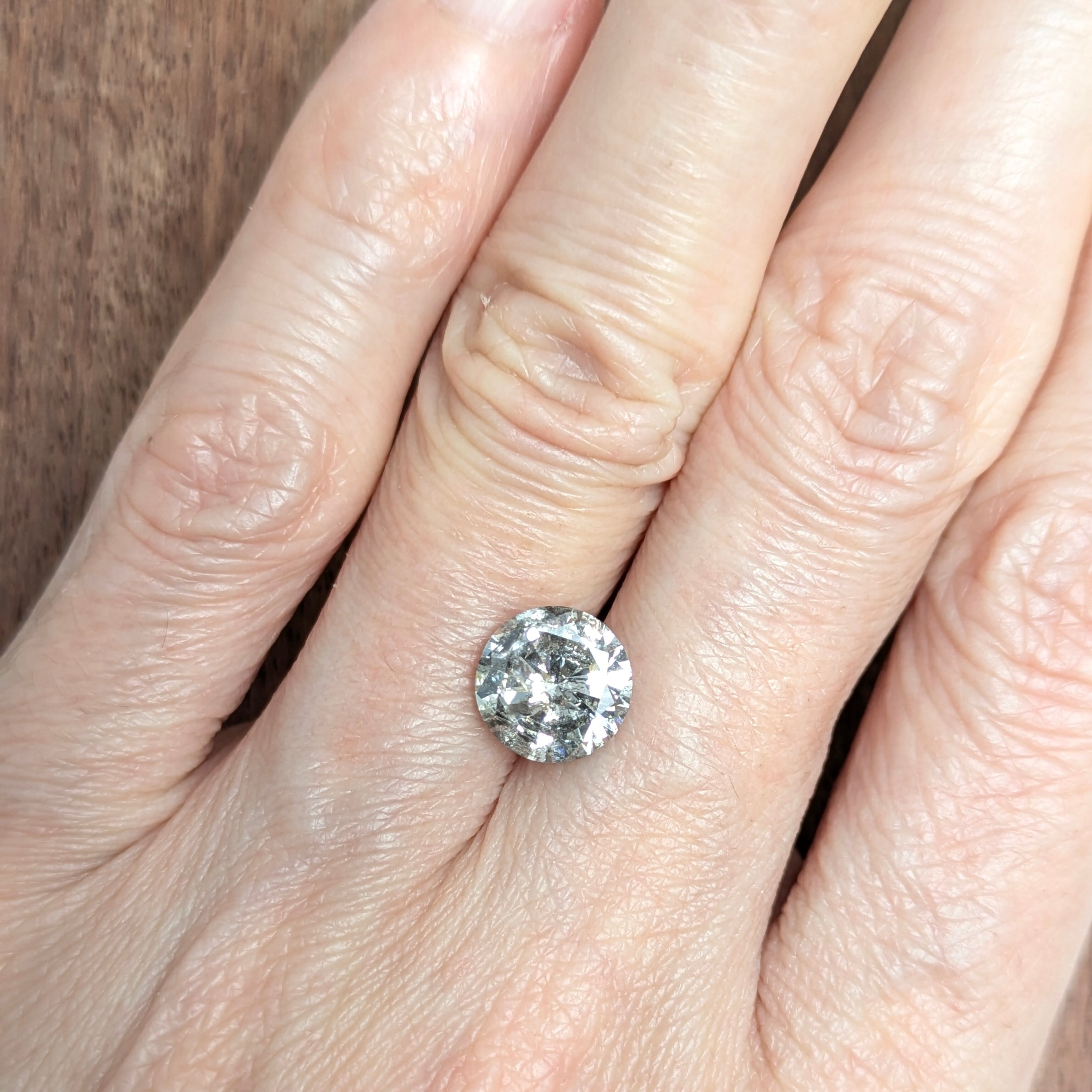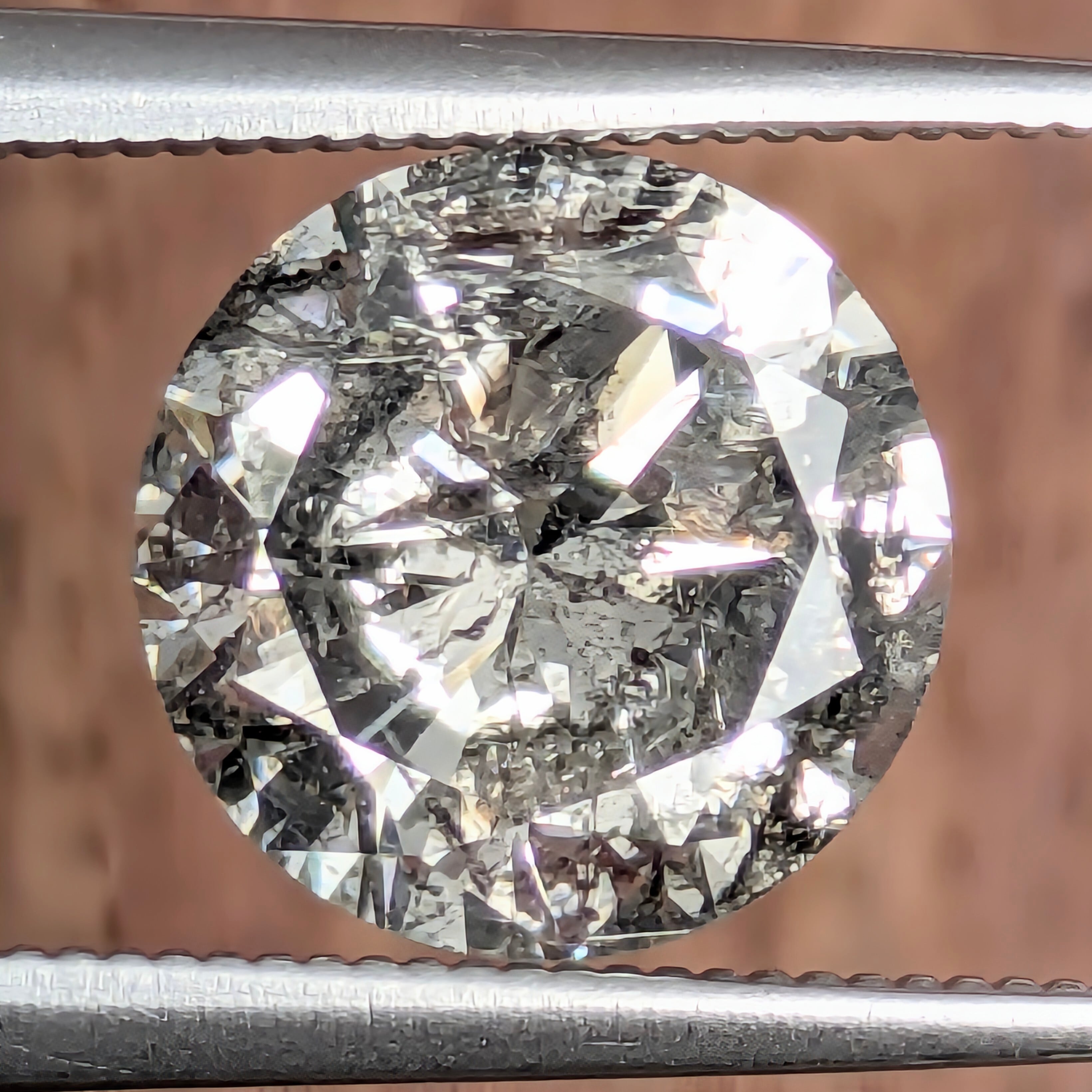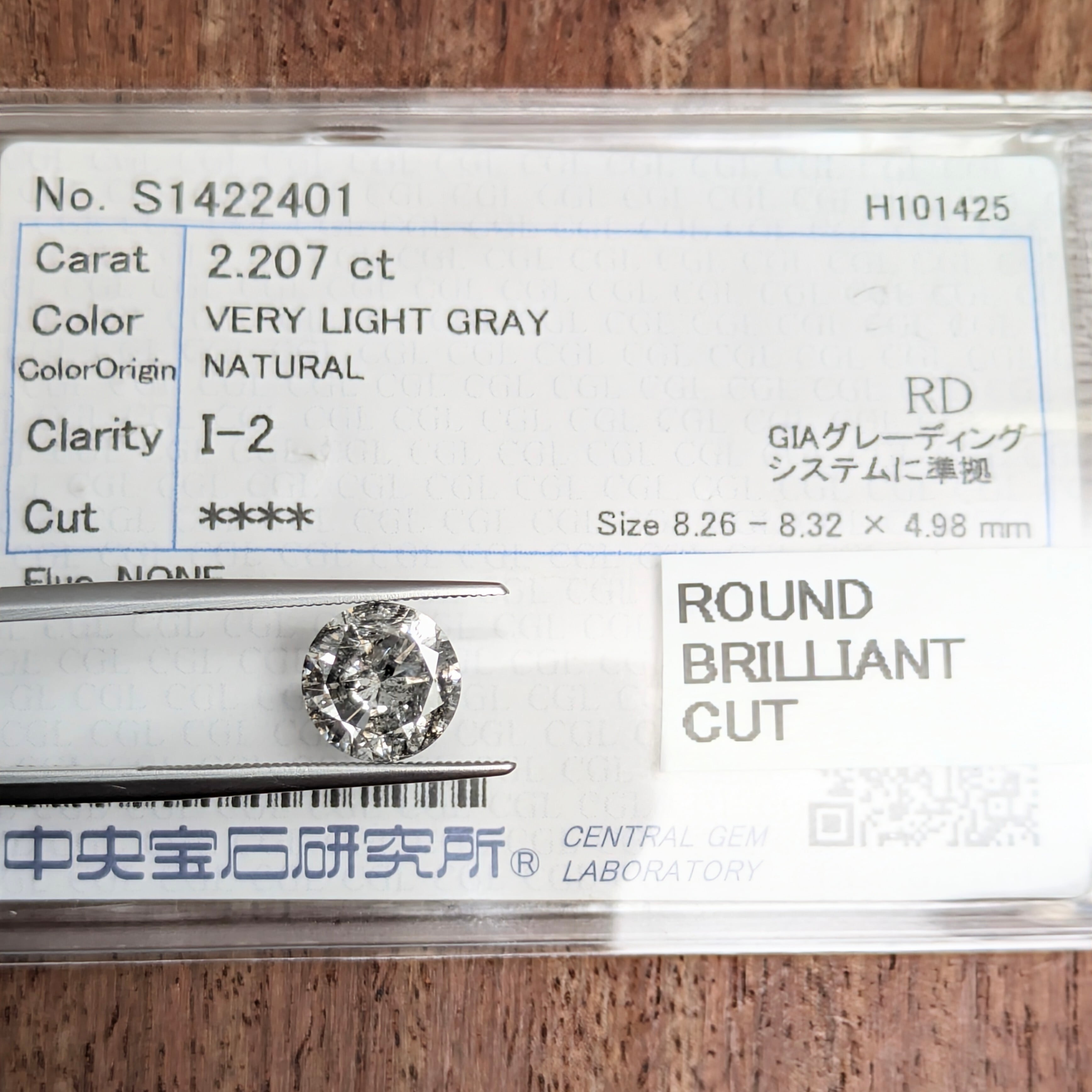 カラーが「VERY LIGHT GRAY」という、とってもクールな輝きのダイヤモンド。クラリティが「I-2」ですが、ビックリするほどテリと輝きの良い1ピースです。ソルトアンドペッパーというほどの濁りはないですが、硬質な白い反射の光とインクルージョンのブラック系のコントラストがモダンな美しさを呼び、2.207ctというボリュームも相まってかなり満足度の高い1ピースです。2カラット越えというボリューム、ダイヤモンドの輝き、天然の証のインクルージョン、全てが詰まっています☆