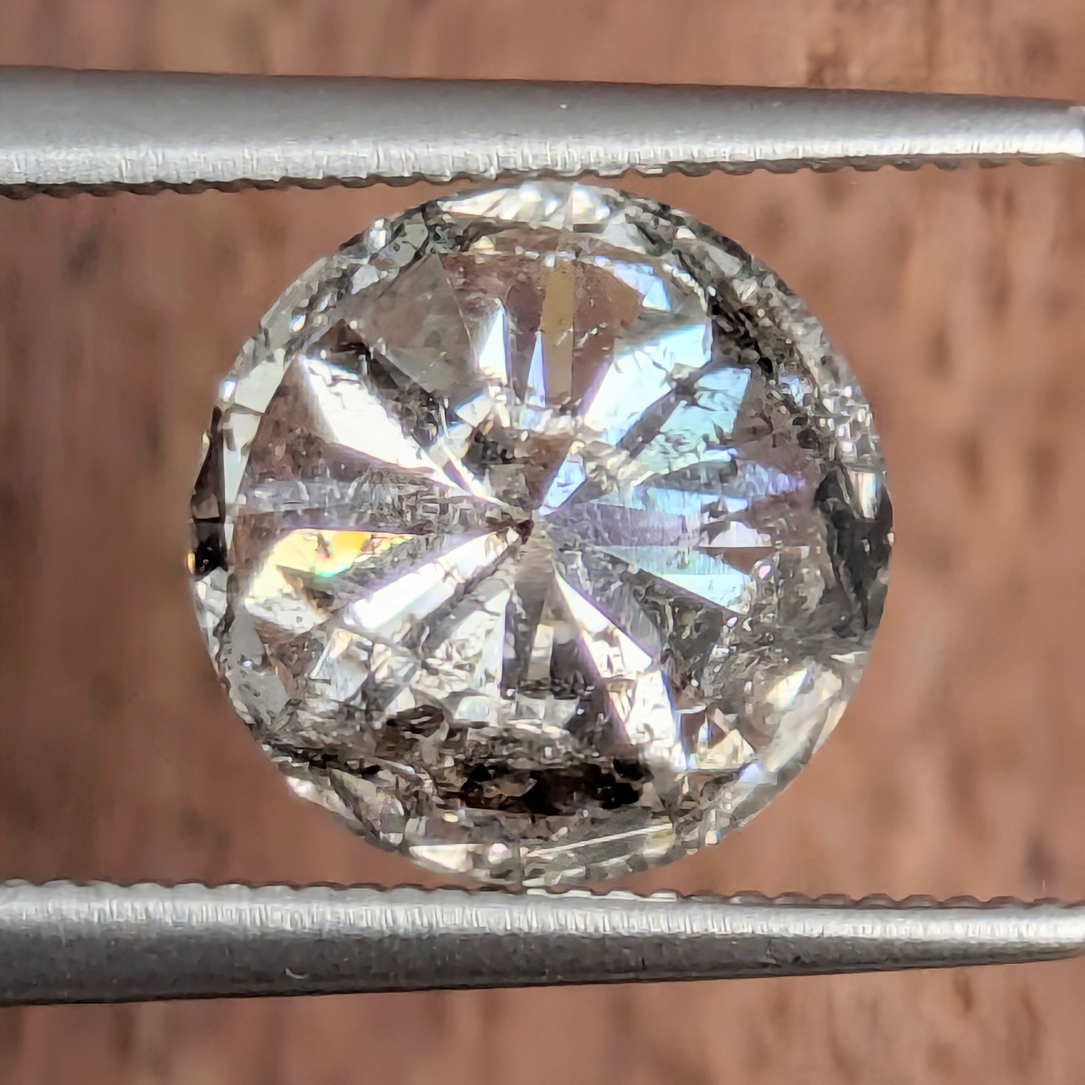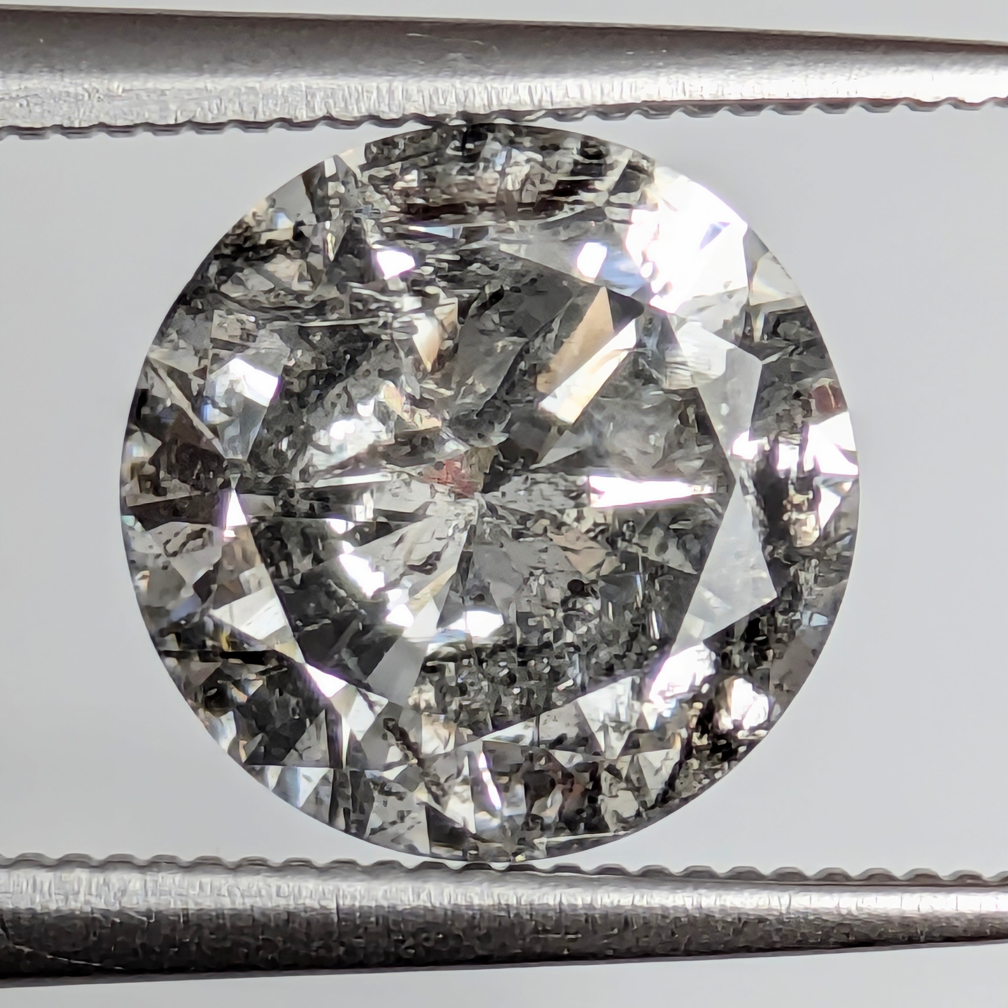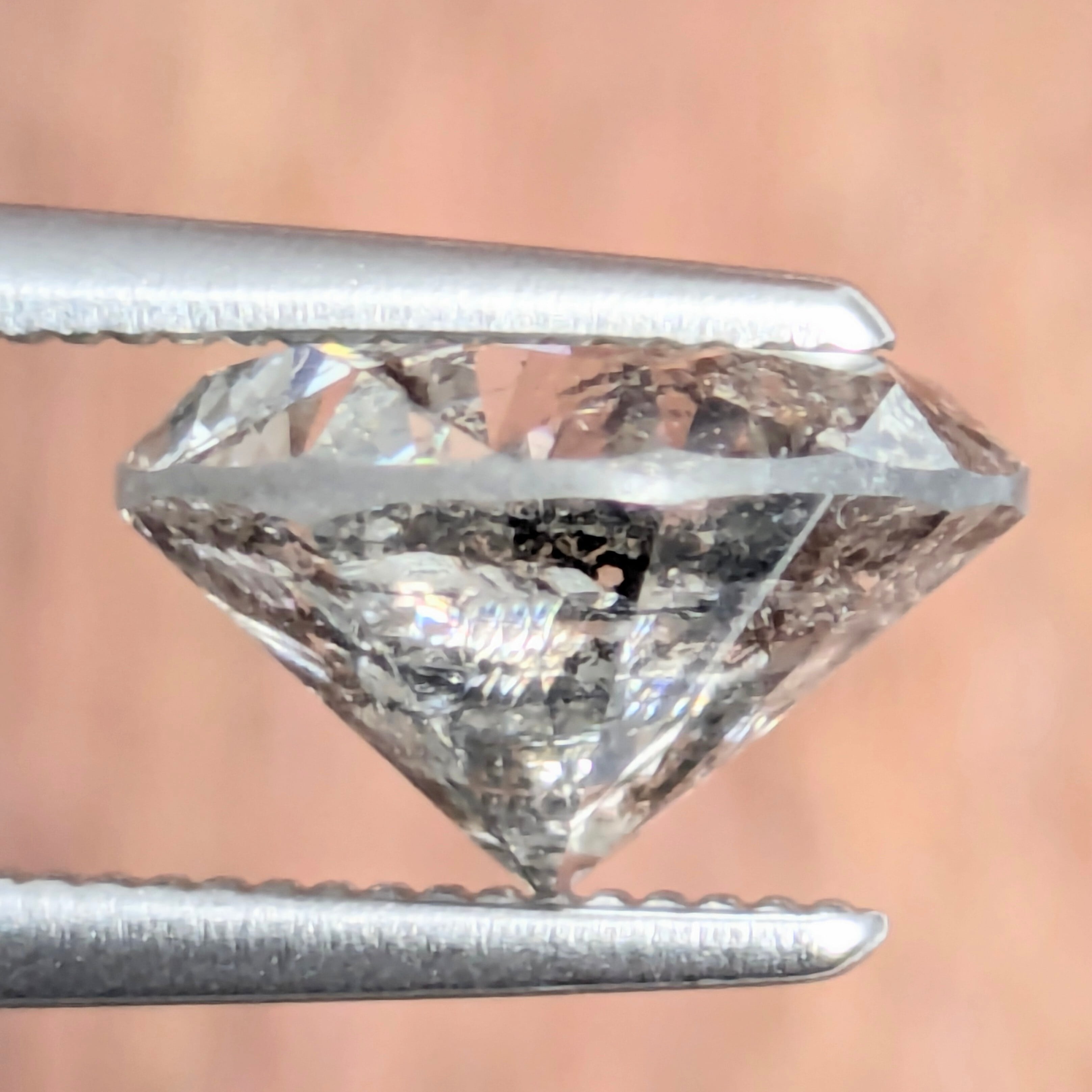 カラーが「VERY LIGHT GRAY」という、とってもクールな輝きのダイヤモンド。クラリティが「I-2」ですが、ビックリするほどテリと輝きの良い1ピースです。ソルトアンドペッパーというほどの濁りはないですが、硬質な白い反射の光とインクルージョンのブラック系のコントラストがモダンな美しさを呼び、2.207ctというボリュームも相まってかなり満足度の高い1ピースです。2カラット越えというボリューム、ダイヤモンドの輝き、天然の証のインクルージョン、全てが詰まっています☆