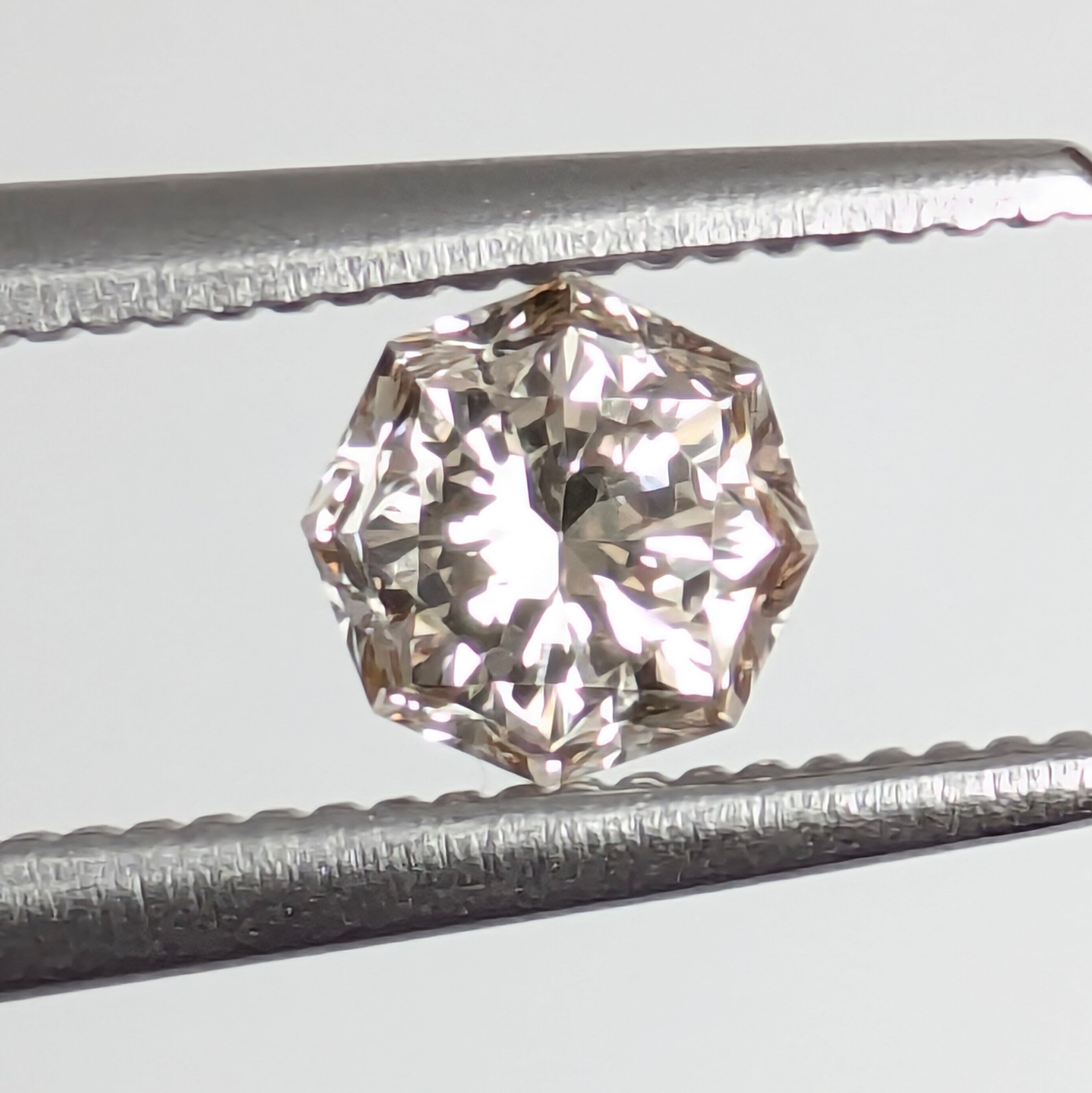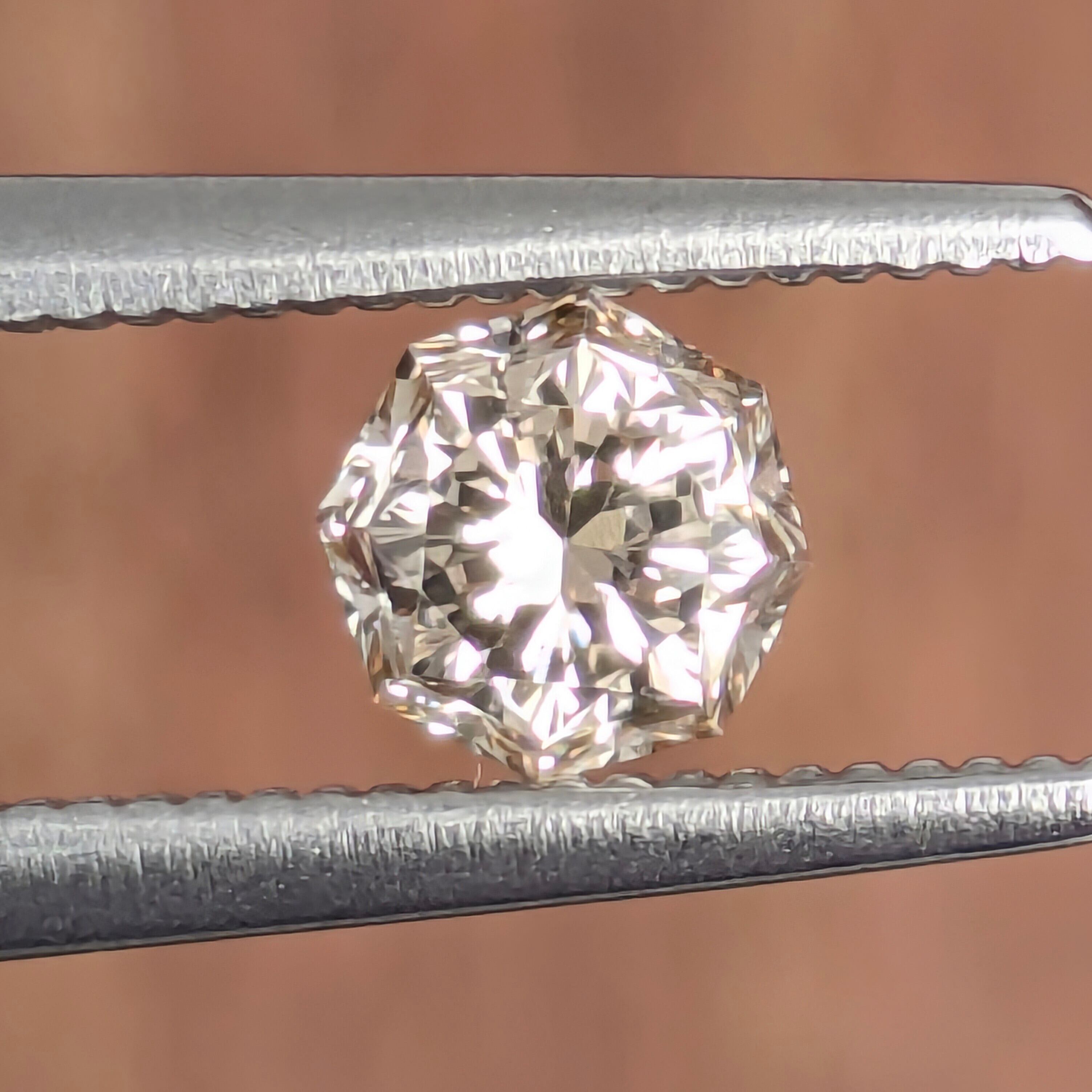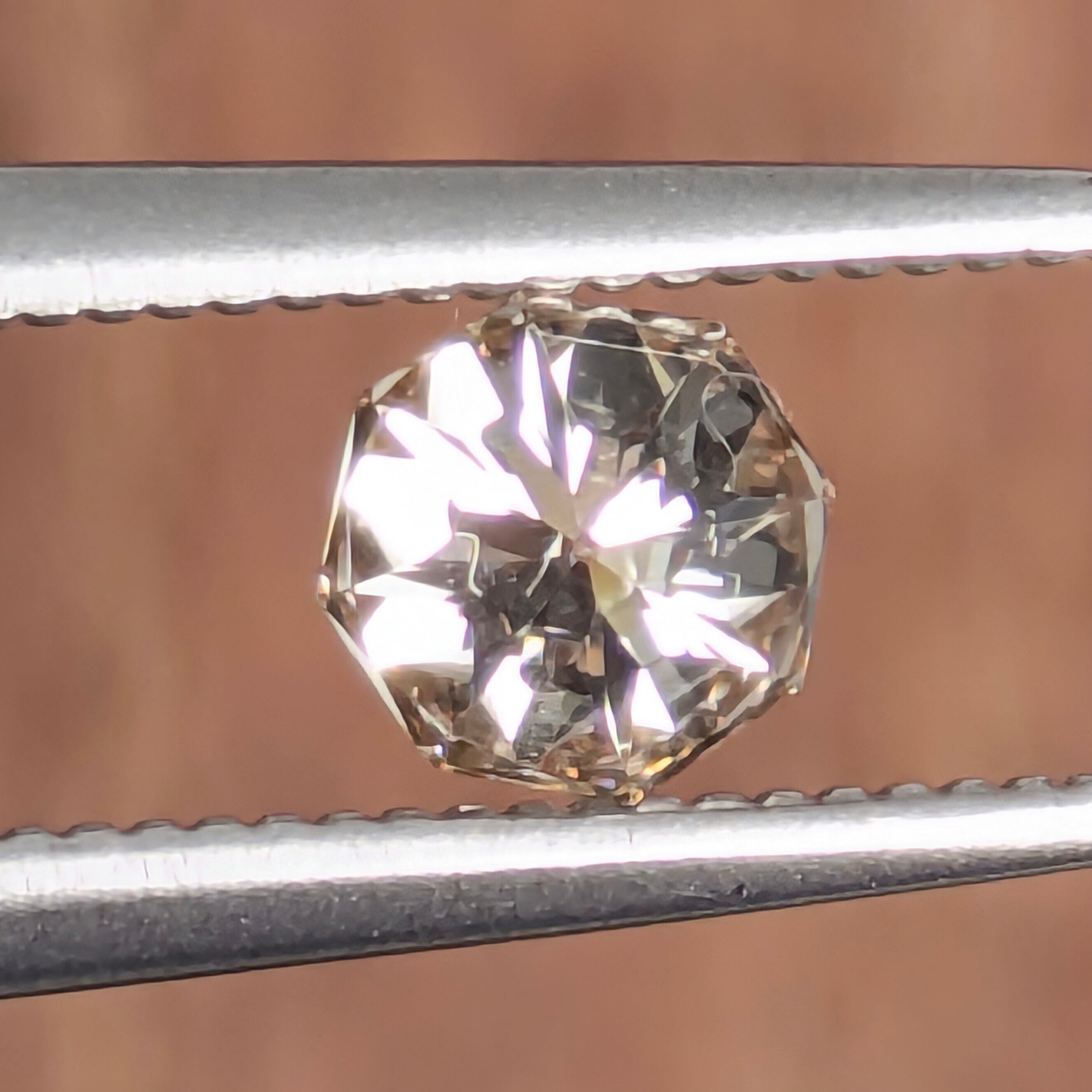 肉眼での輝きの印象は、まるで甘い金平糖のようにキラキラ、ピカピカととても輝きの強い1ピース。外形の「八角形」もインパクトを添える一要素になっています。うっすらと色味を感じるブラウンは、さりげなく大人なイメージも感じさせます、ルーペで覗くと、そのカットの正体は桔梗の花を思わせるようなとても繊細なカット面の連なり。SI-1のインクルージョンはテーブルの端に無色系のものがありますが、もちろん美しさを妨げるようなものではありません。