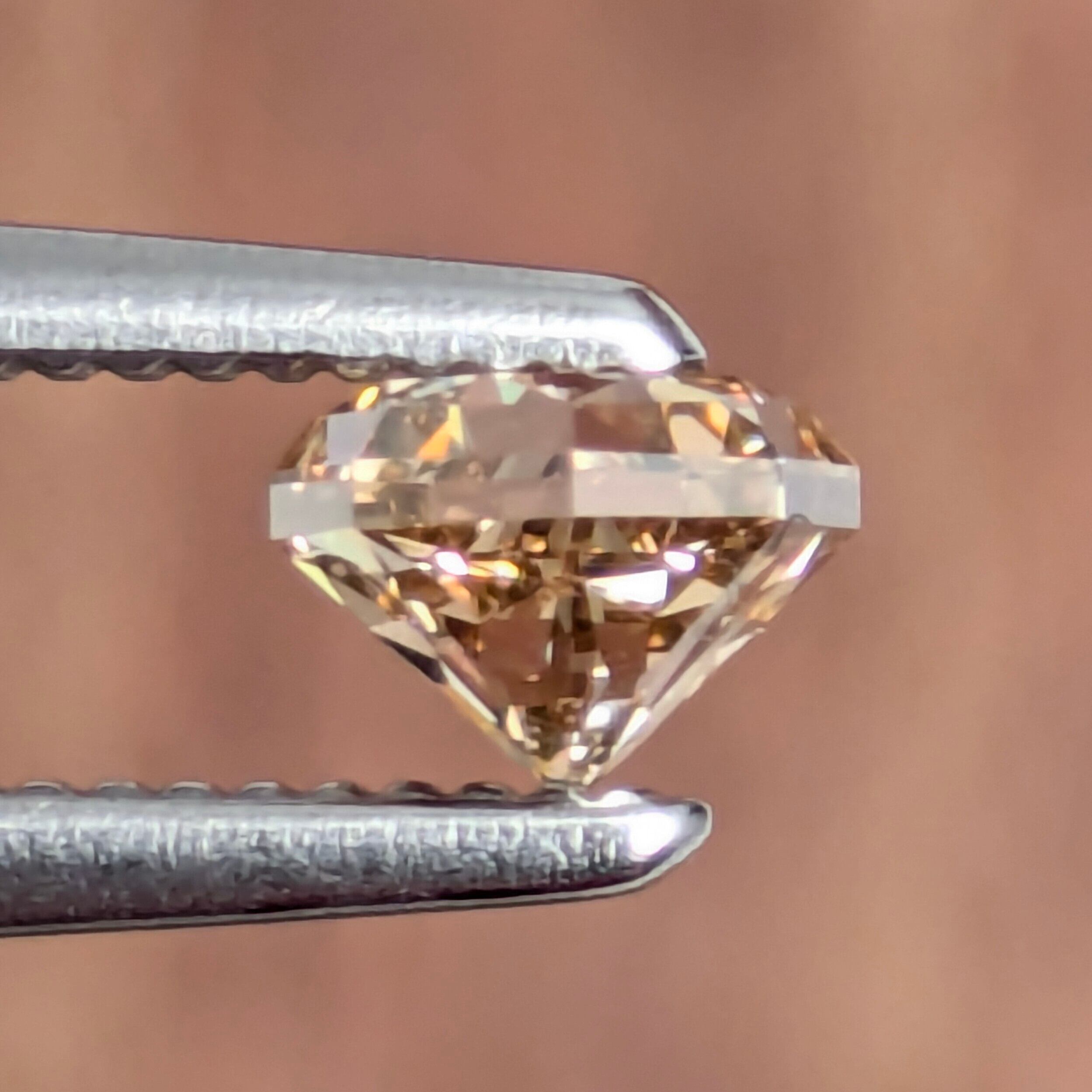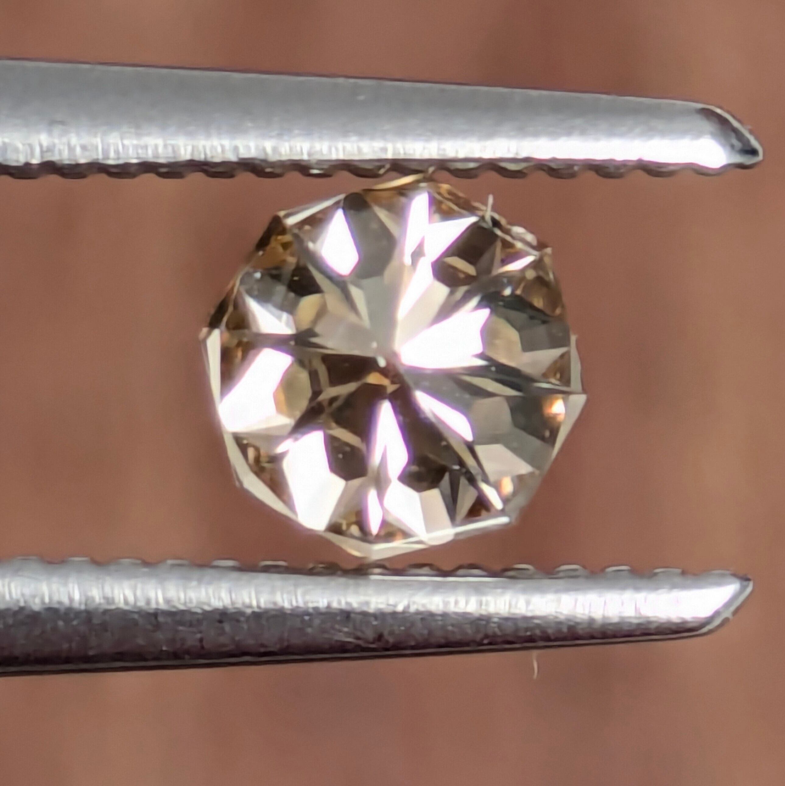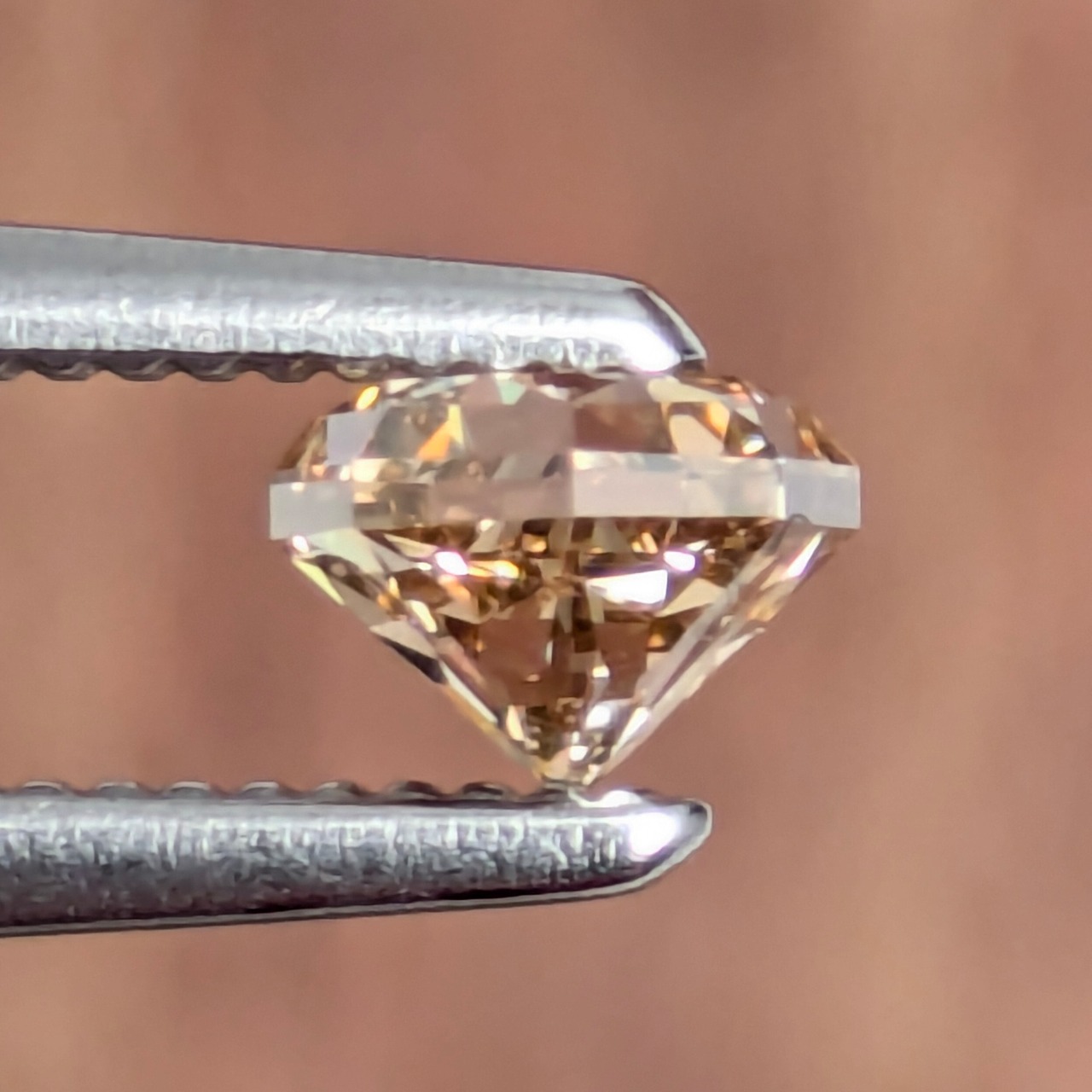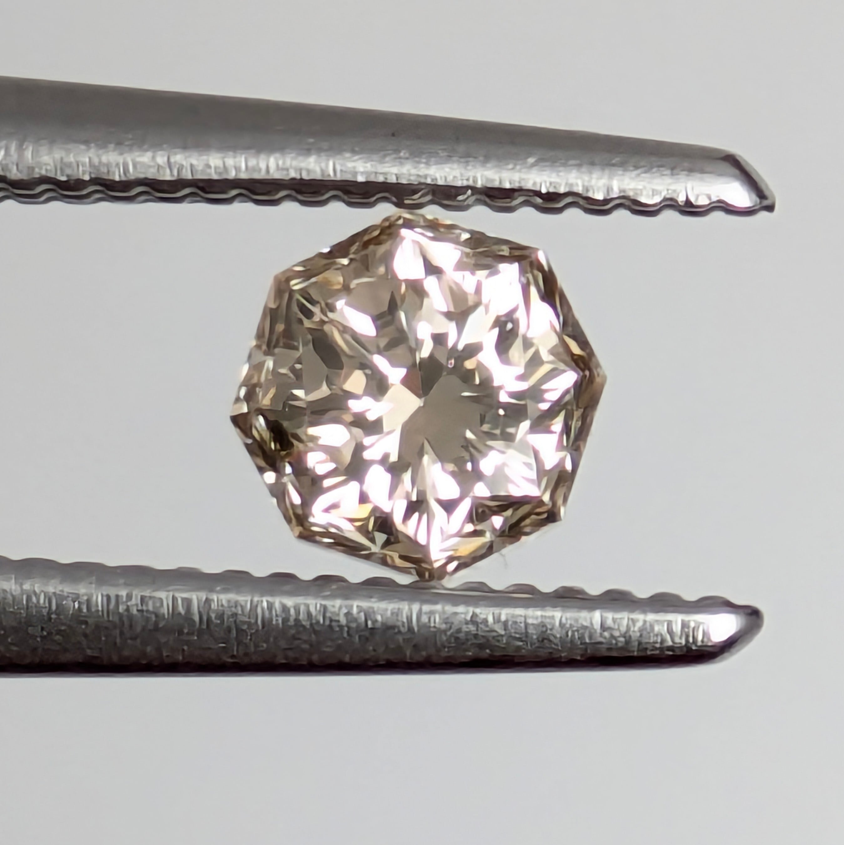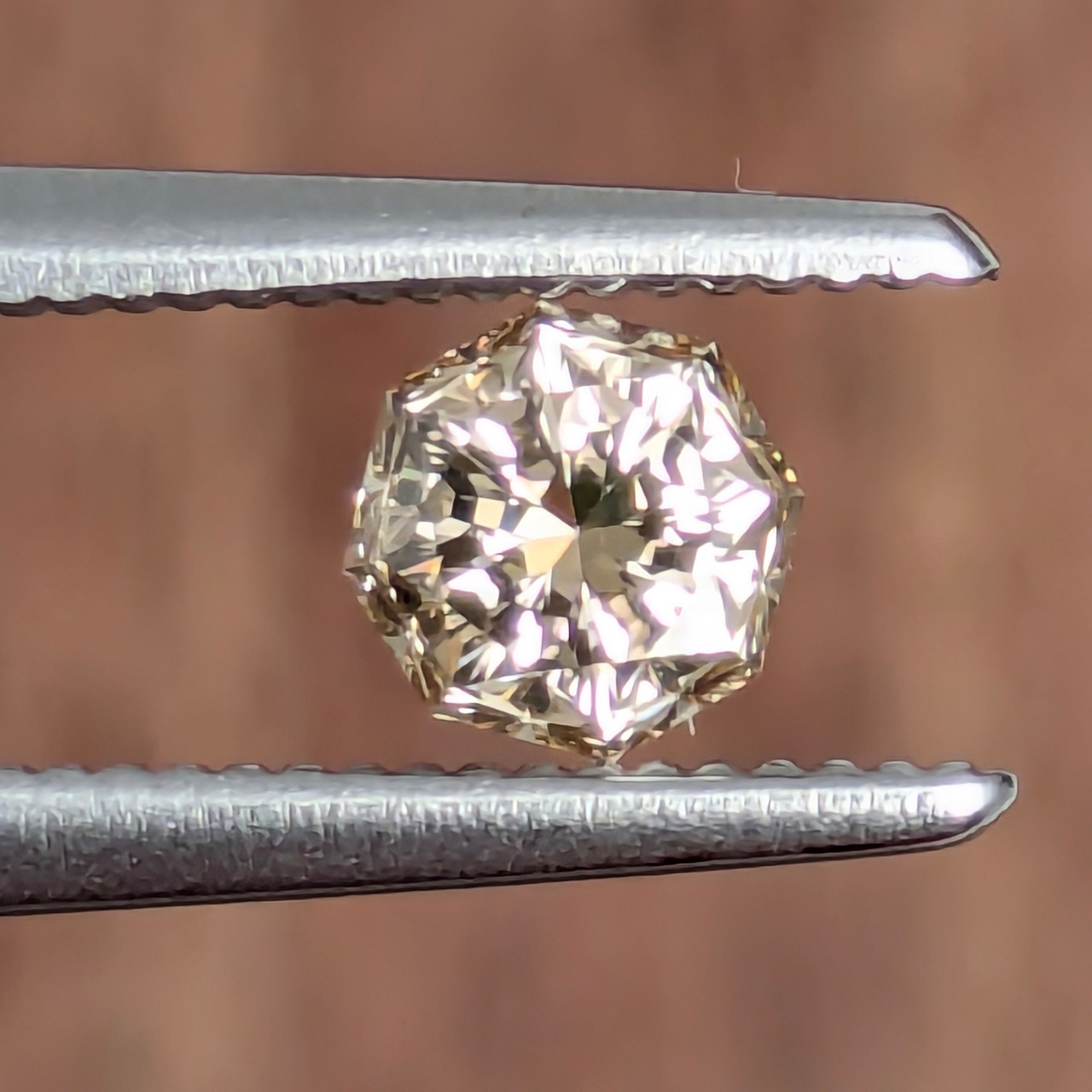 ブリリアントカットと、ステップカットが複雑に織り交ざった、輝きの強いモディファイドカット。アウトラインは星を連想させる八角形で、地球の大地を思わせるブラウンとの相乗効果により、まるで小さな惑星が輝いているように感じられます。VS-2という透明度の高さも相まって、落ち着いた色合いでありながら華やかさも併せ持つ見事な1ピース!ダイヤモンドに限っては、「茶色は地味」という表現は当てはまりません。