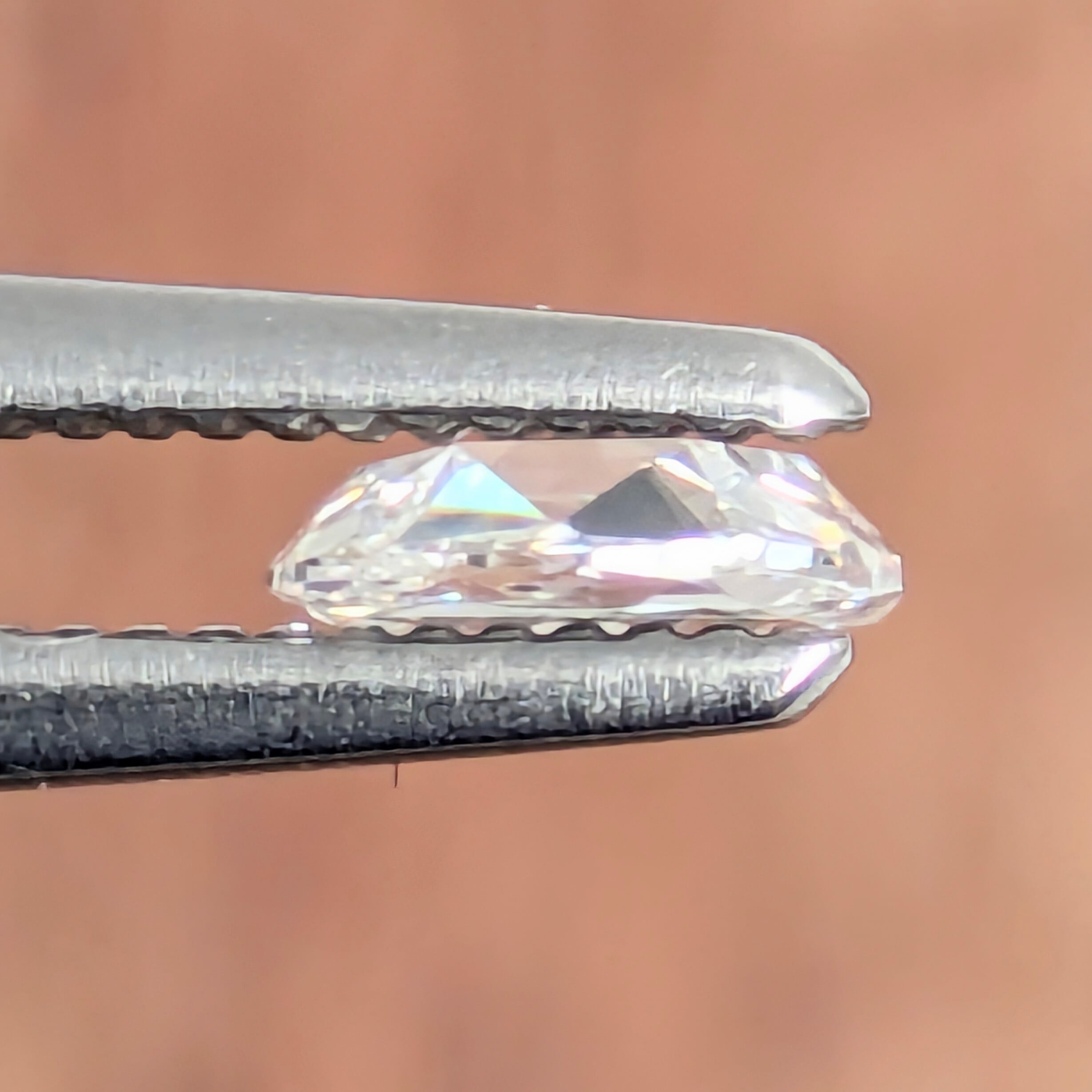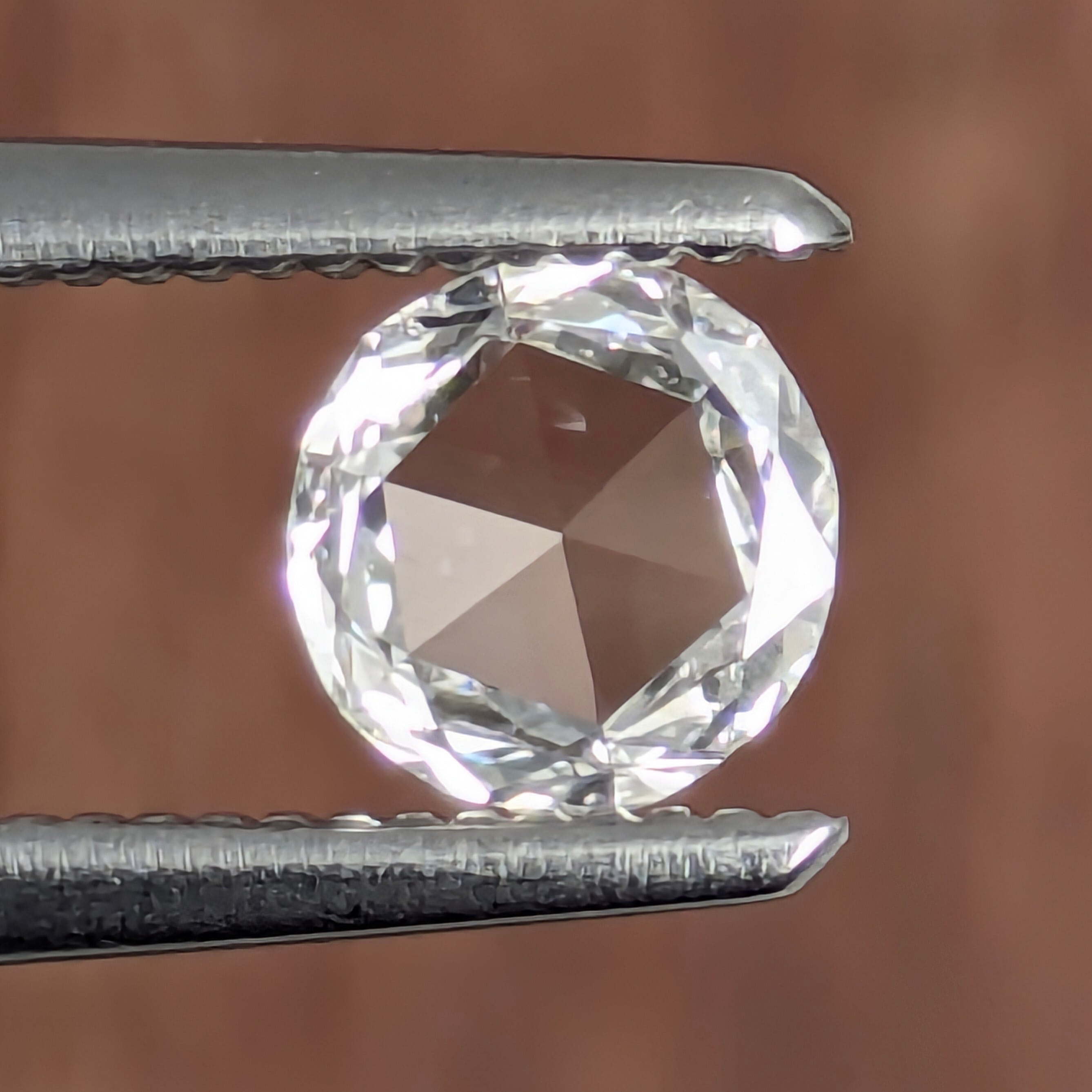 透明度が命のローズカット・ダイヤモンド。カラーはEと、申し分ありません。クラリティのSI-1は、端の方にチョロチョロと小さく見られるフェザー。幸運にも、屈折の関係でフェイスアップ(石の上面)からは気になりません。ローズカットの語源は、その形が【薔薇のつぼみ】に似ているからだと言います。つぼみの状態でこんなにも魅力的に輝くのであれば、それが花開いた時はどのような光の迸りなのか・・・!花咲くその姿を、見てみたいものです。