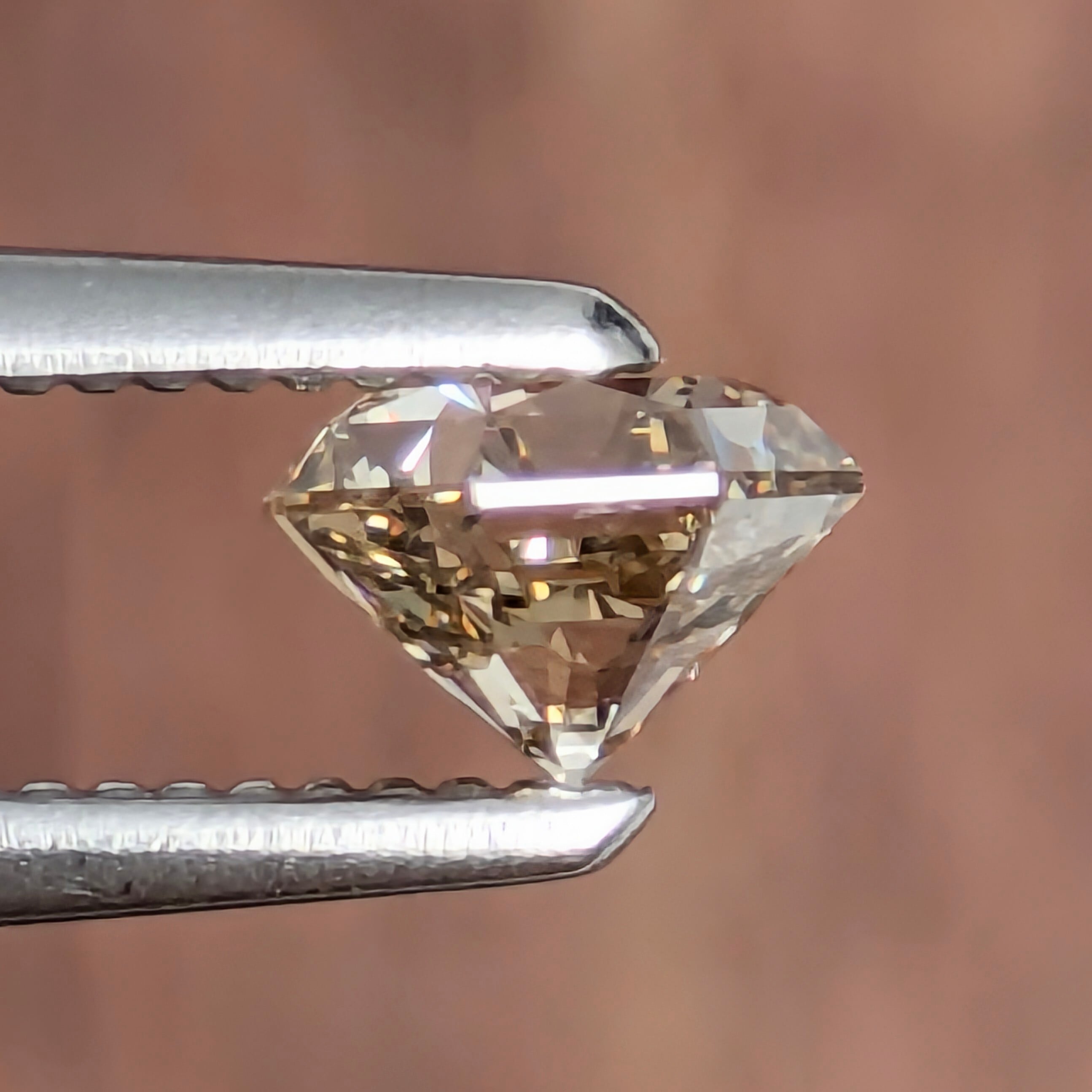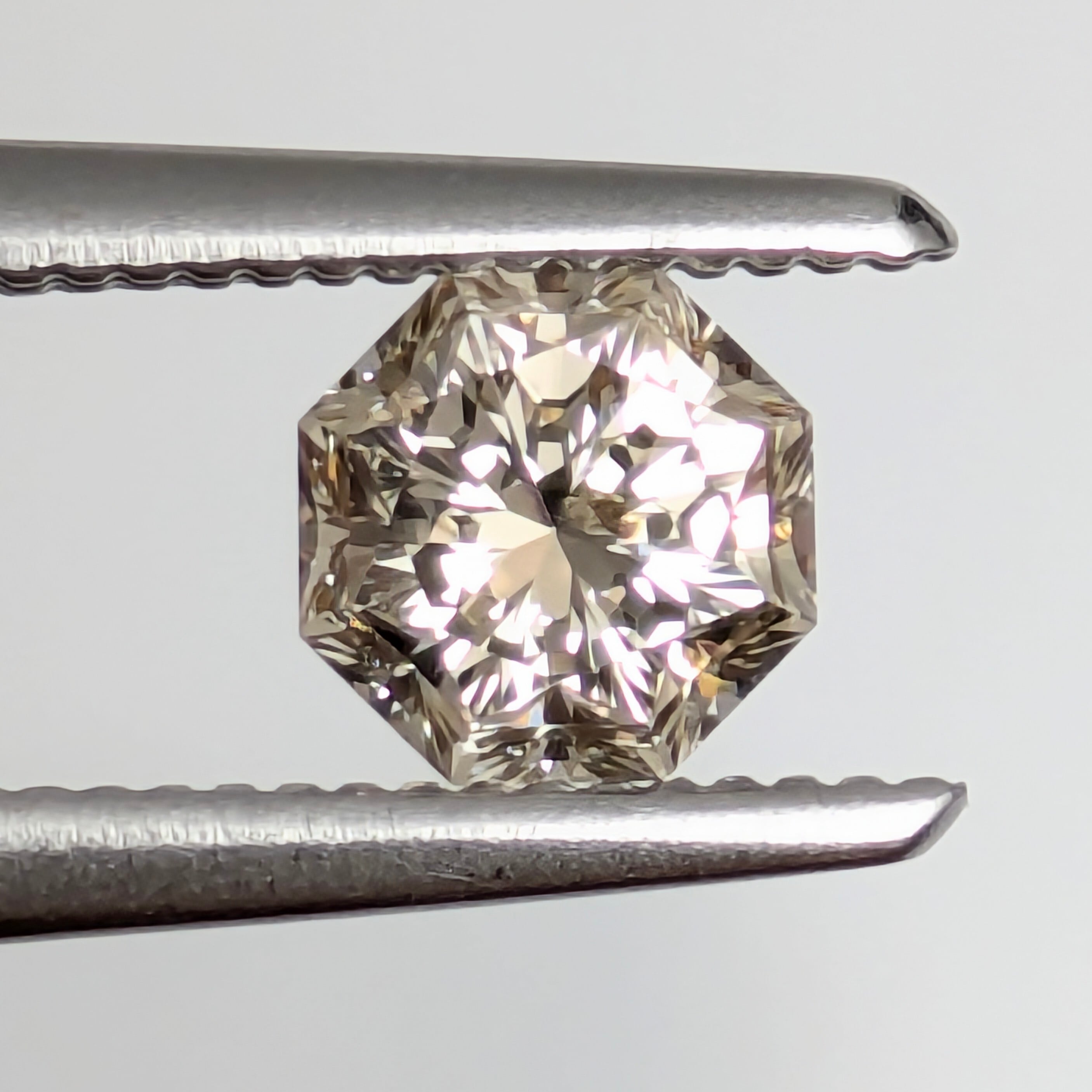 個人的には、このタイプのオクタゴナル・モディファイドカットのダイヤモンドが描き出す直線折り重なる輝きは、六分咲きの薔薇の花のように感じます。幾重にも贅沢に折り重なったバラの花びら。その一枚一枚の間にひっそりと潜んでいる朝露の煌めきが、「まだまだここに居たい」と名残惜しそうに、昇り始めた太陽の光と熱で昇華される瞬間の輝きにも感じられる1ピース。淡いブラウンが、角度によってはいろいろな色相なブラウン~ブラウンピンクにも見えるのも不思議です。