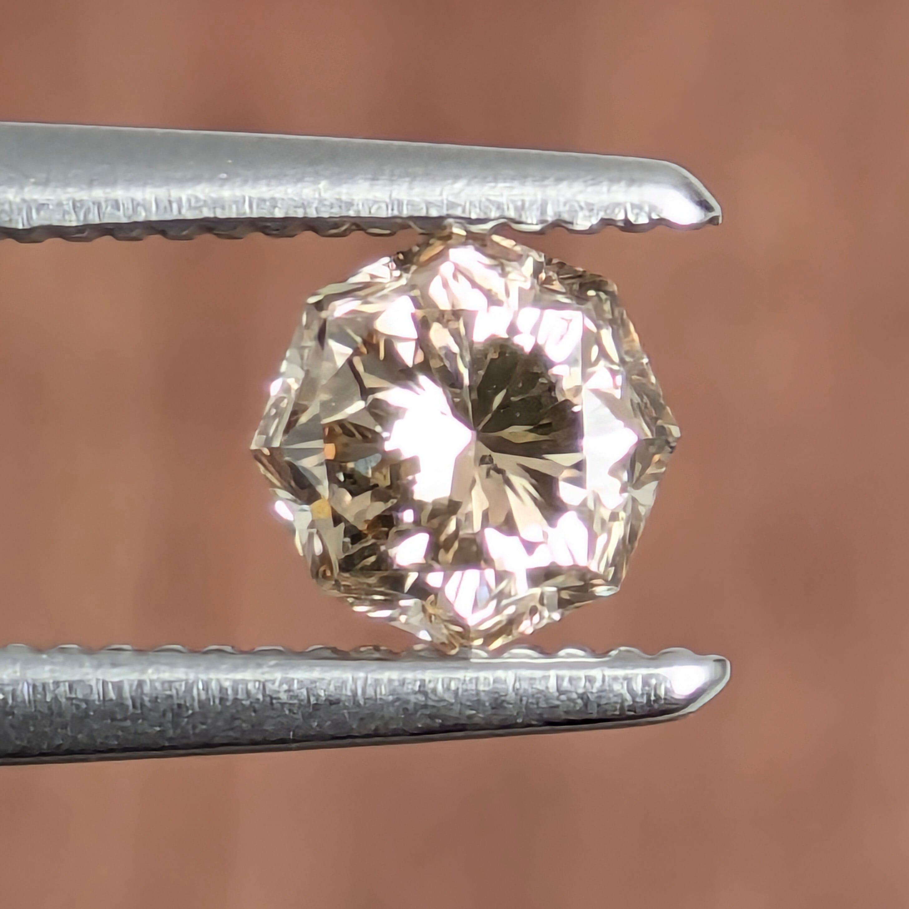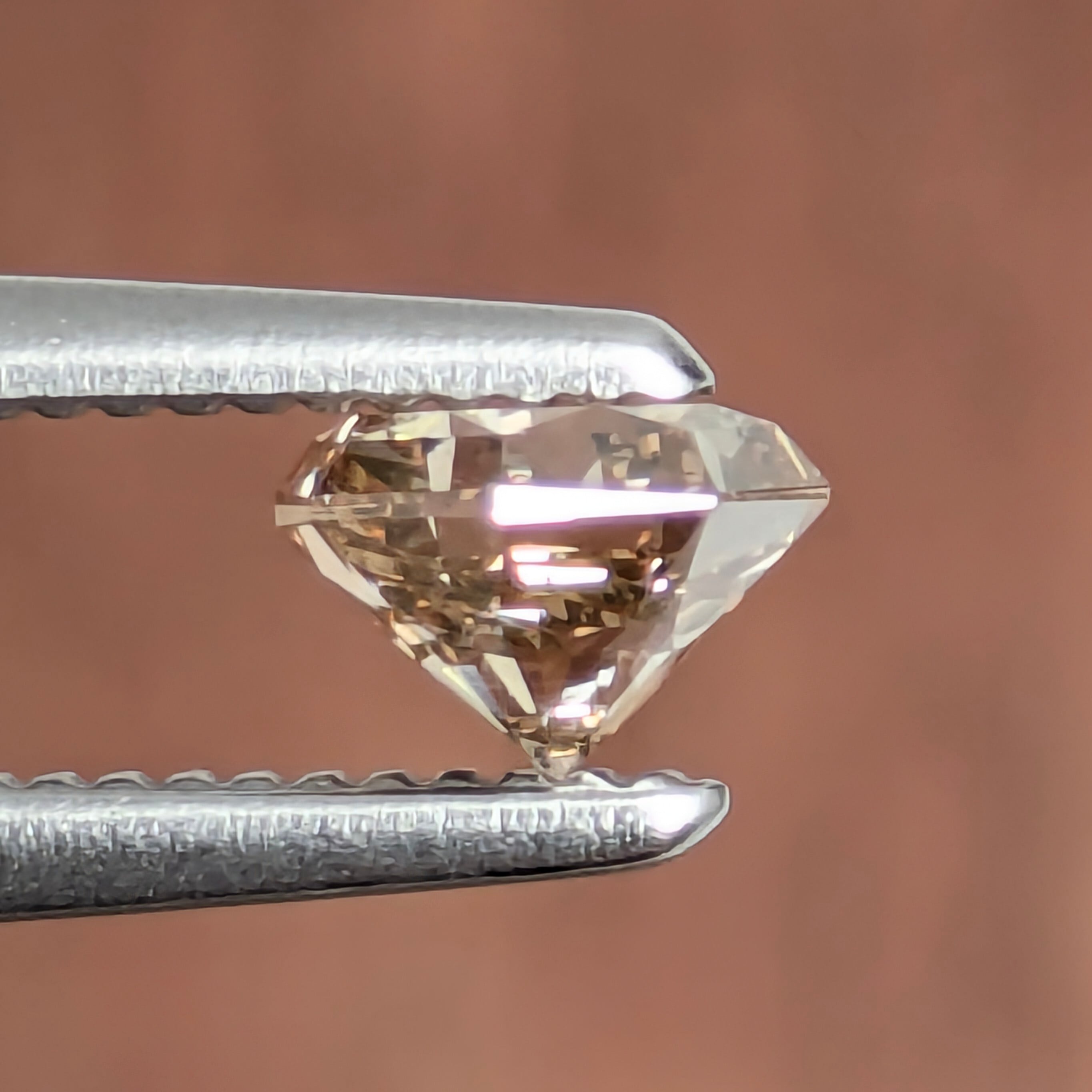 ダイヤモンドの『輝き』の凄いところは、多少のインクルージョンの存在は『飛ばしてしまう』というところです。なおかつカラーダイヤモンドになると、もうよほどのことが無い限り「クラリティ」というものはそこまで重要ではありません。今回のブラウンダイヤモンドも、強い輝きと華やかさを併せ持った1粒。多少のカーボンやクラウドはありますが、肉眼でその美しさを邪魔するようなものではありません。安心して楽しめる1ピースです。