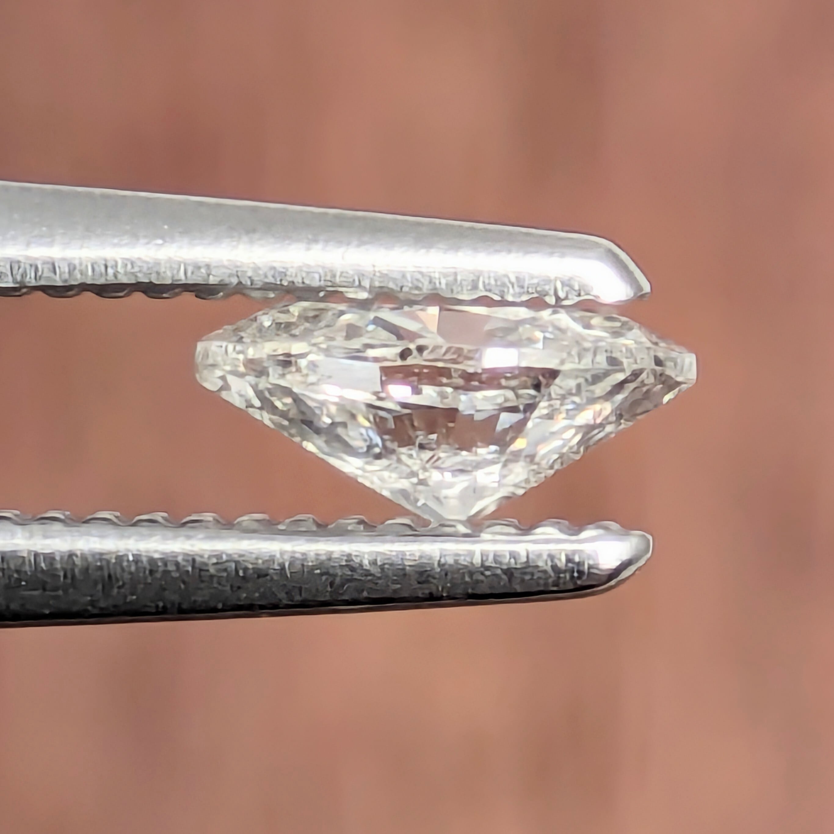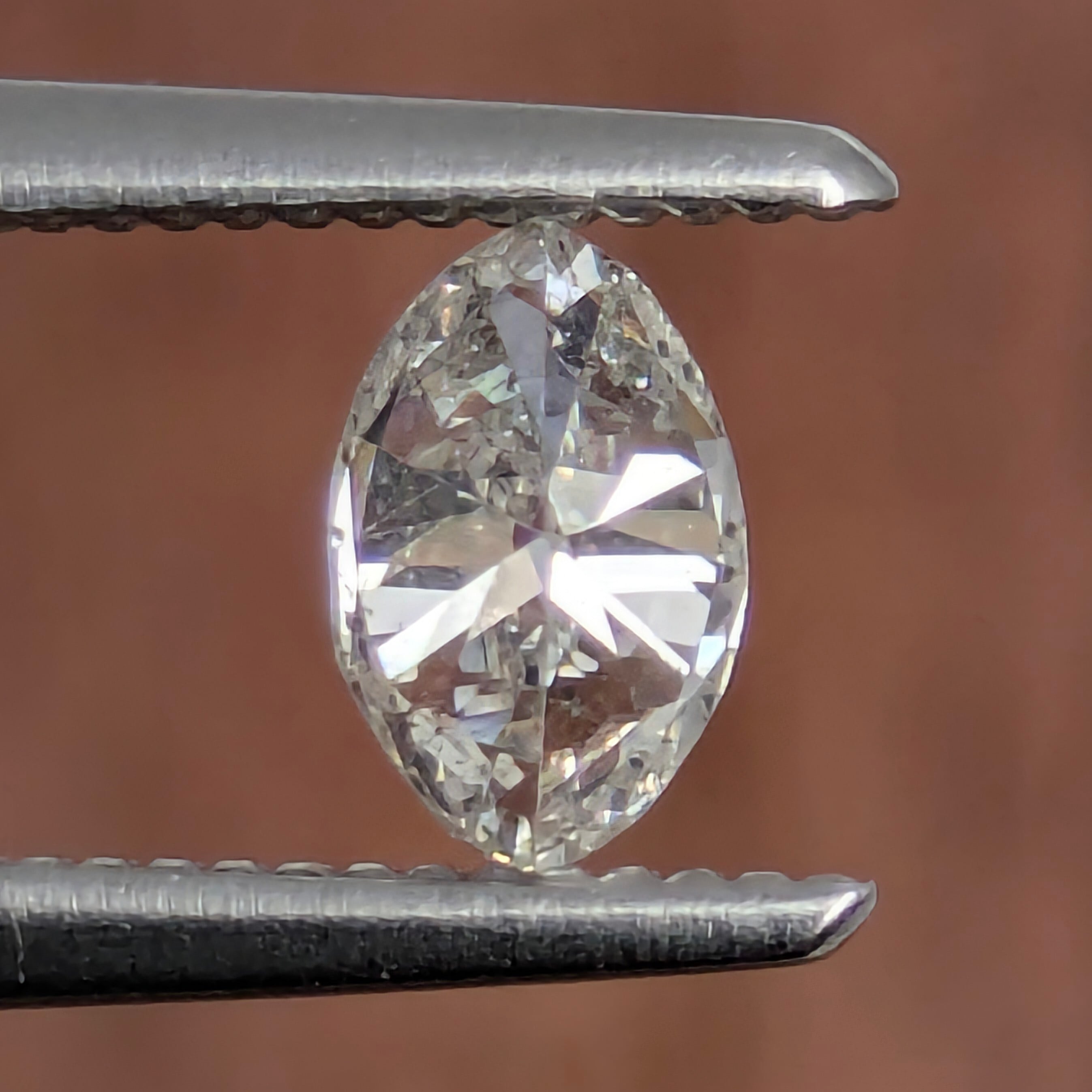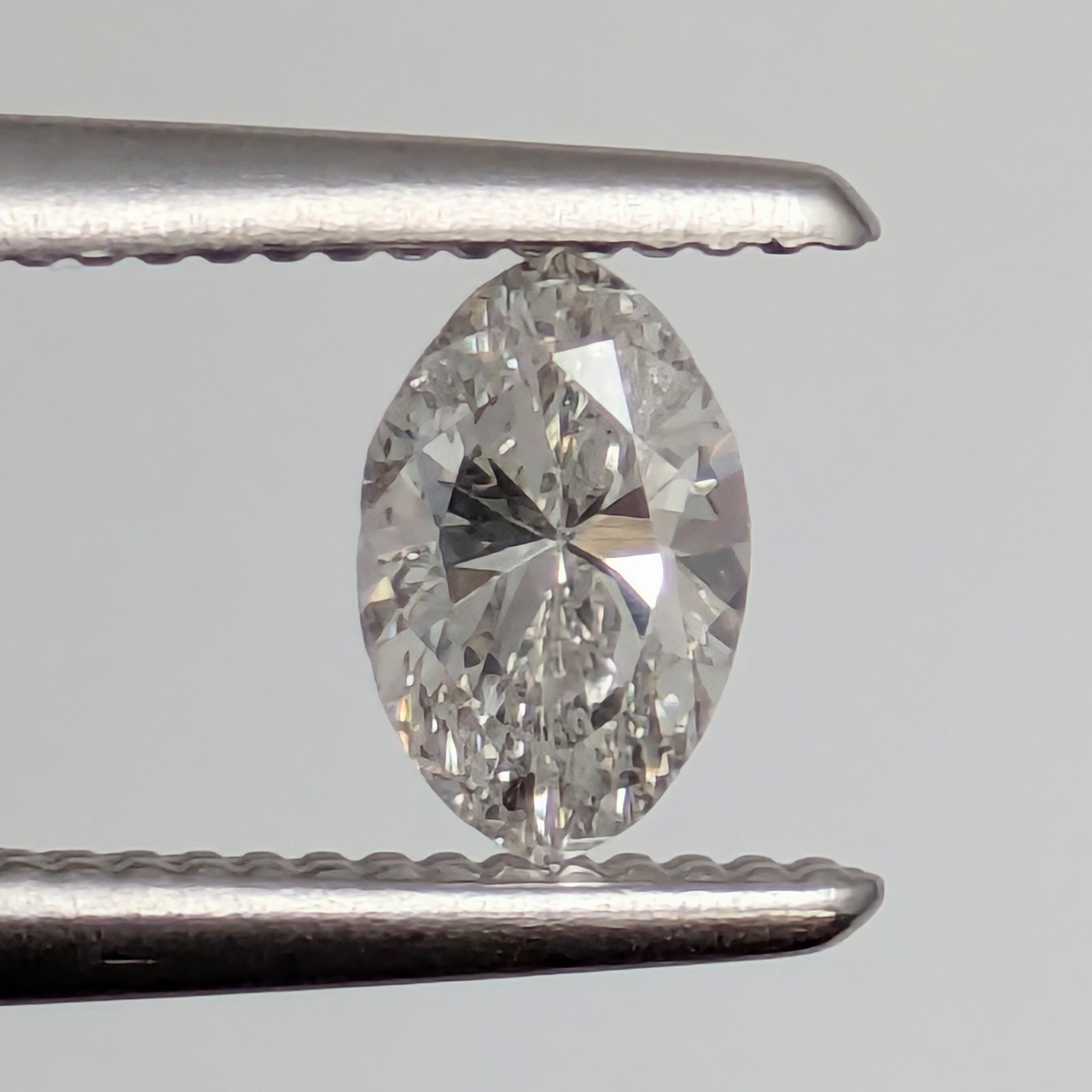 肉眼での輝きには全く影響ないですが、「SI-2」のグレードとして尖った両サイドにホヨホヨと入っているフェザーたち。でもこれは、一番カットが細かくて輝きの強い両サイドに分散されていることで、肉眼でその美しさを損なうようなものではありません。むしろ、10倍のルーペで覗き込んだ時に、まるでアーモンド形の窓から覗く草原の草葉と降り注ぐ陽光のコラボレーションのようで、つい「ふふっ」とほほ笑んでしまう美しさです。