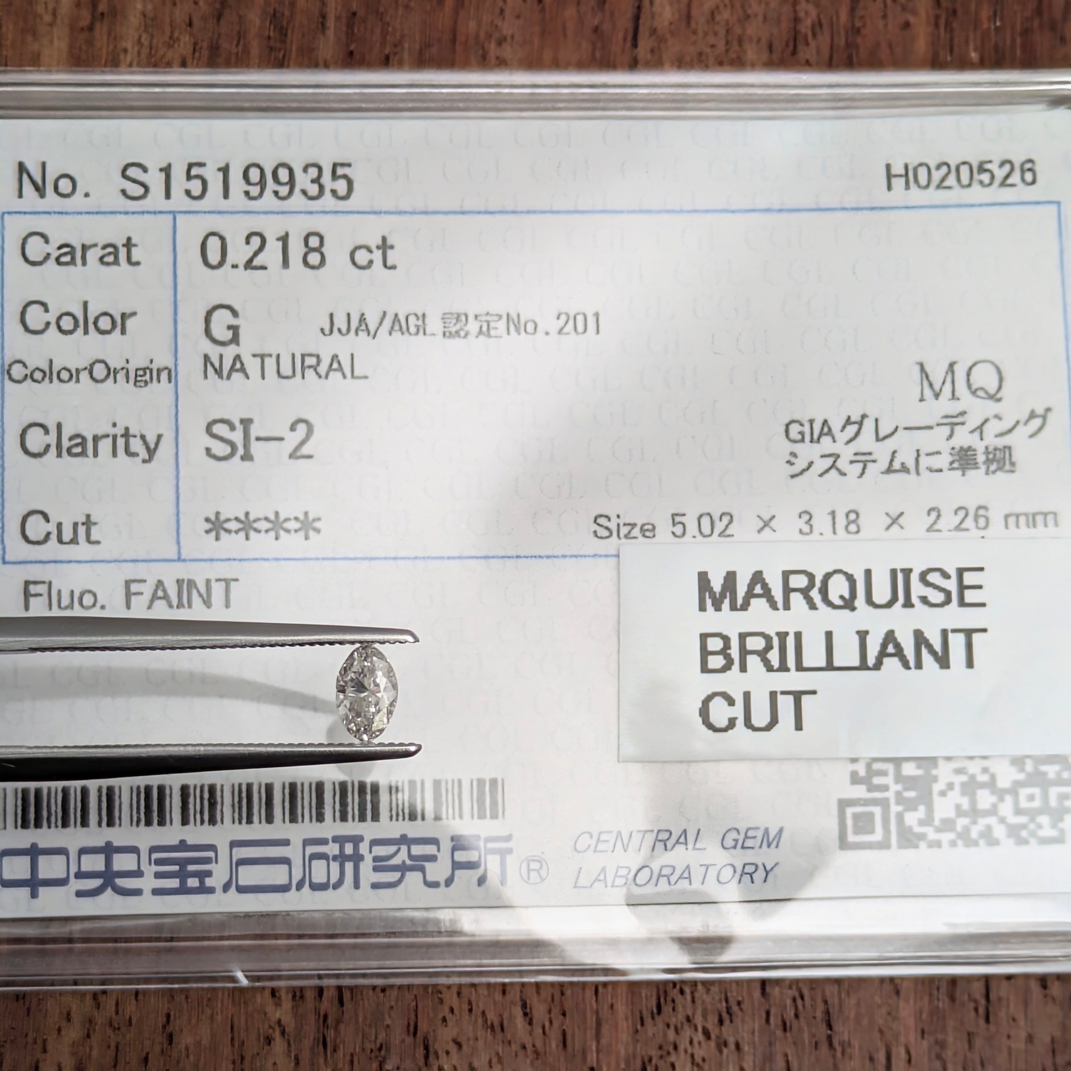 付属品:G SI2 MARQUISE BRILLIANT CUT 中宝研ソーティング