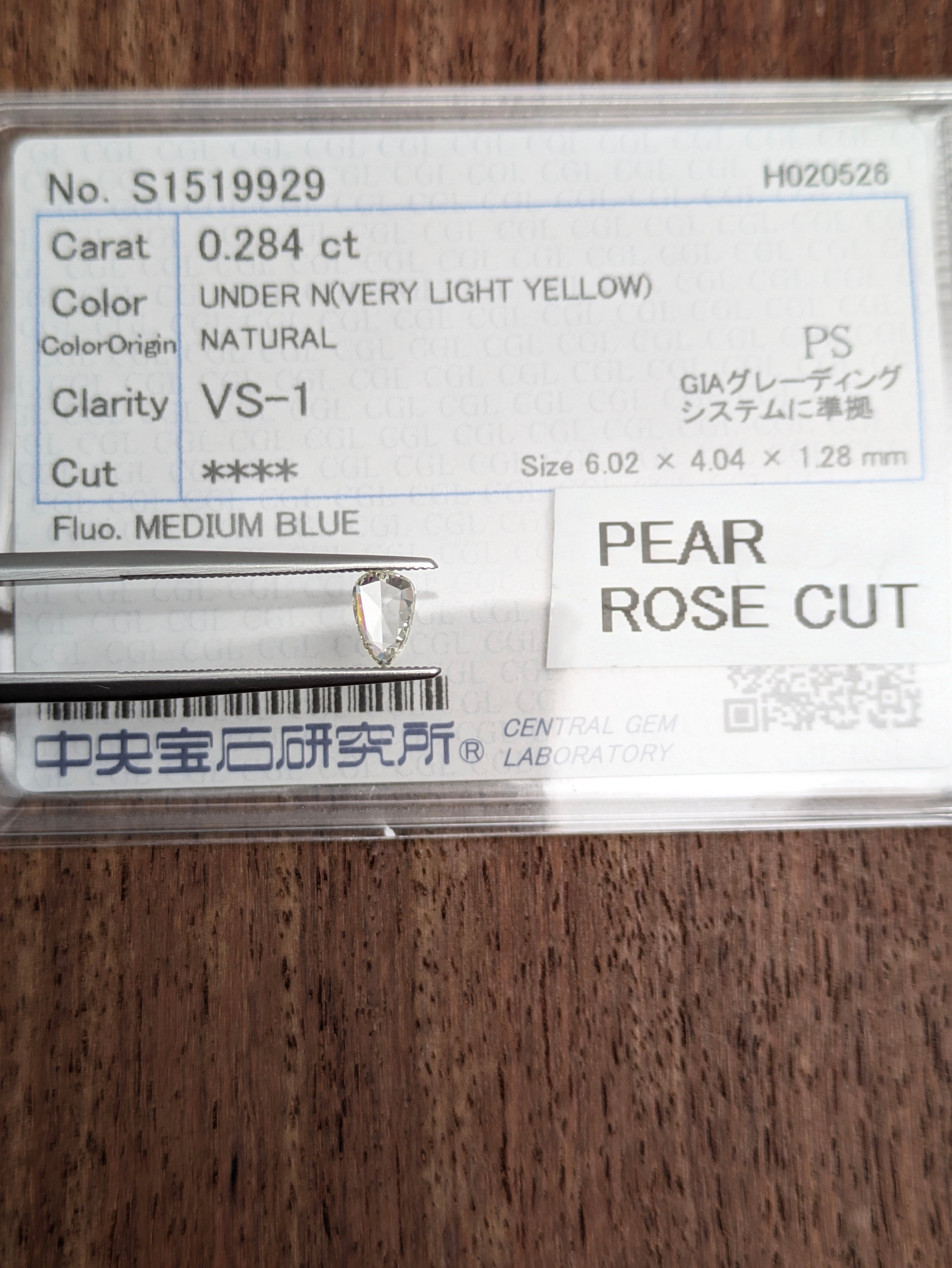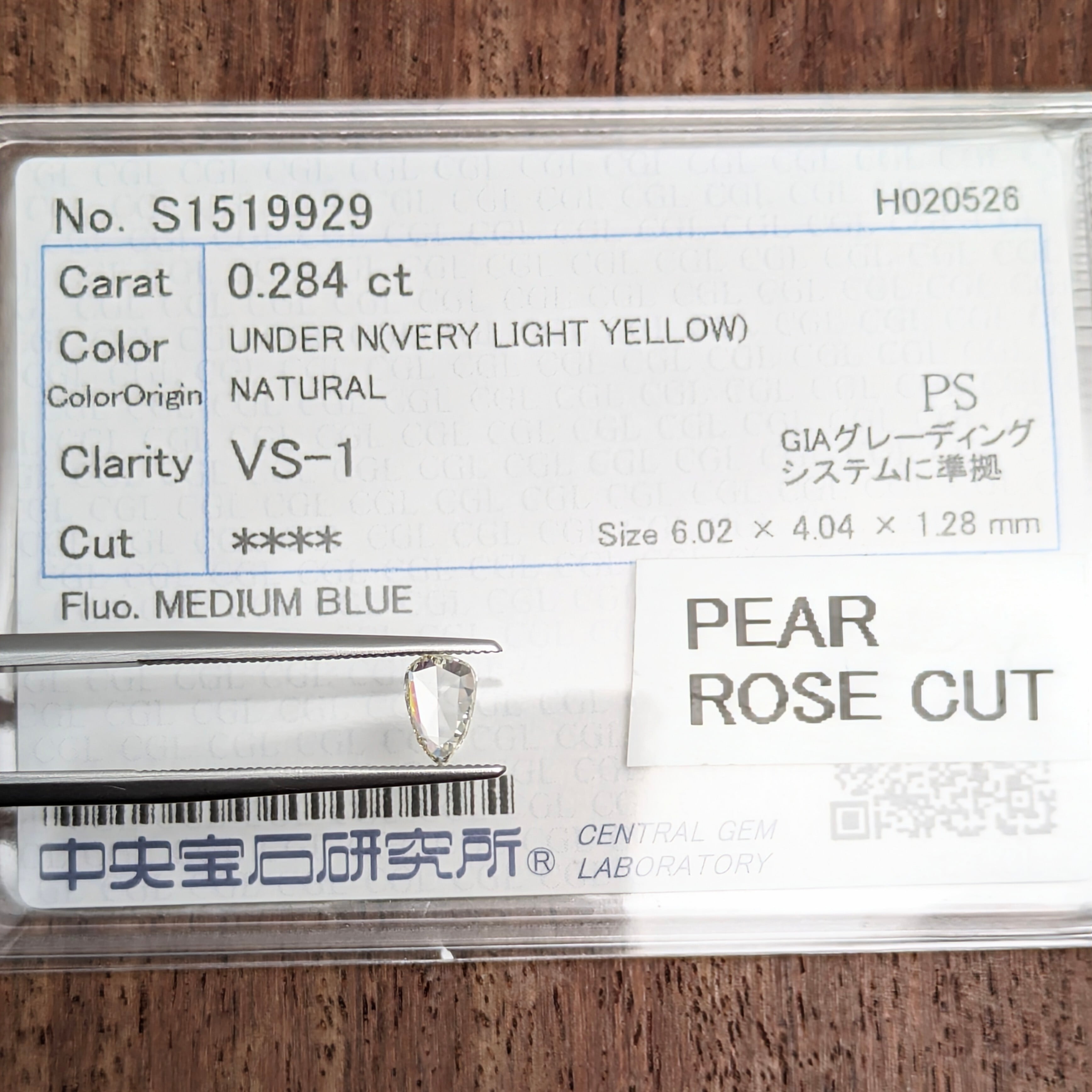 付属品:VERY LIGHT YELLOW VS1 PEAR ROSE CUT 中宝研ソーティング
