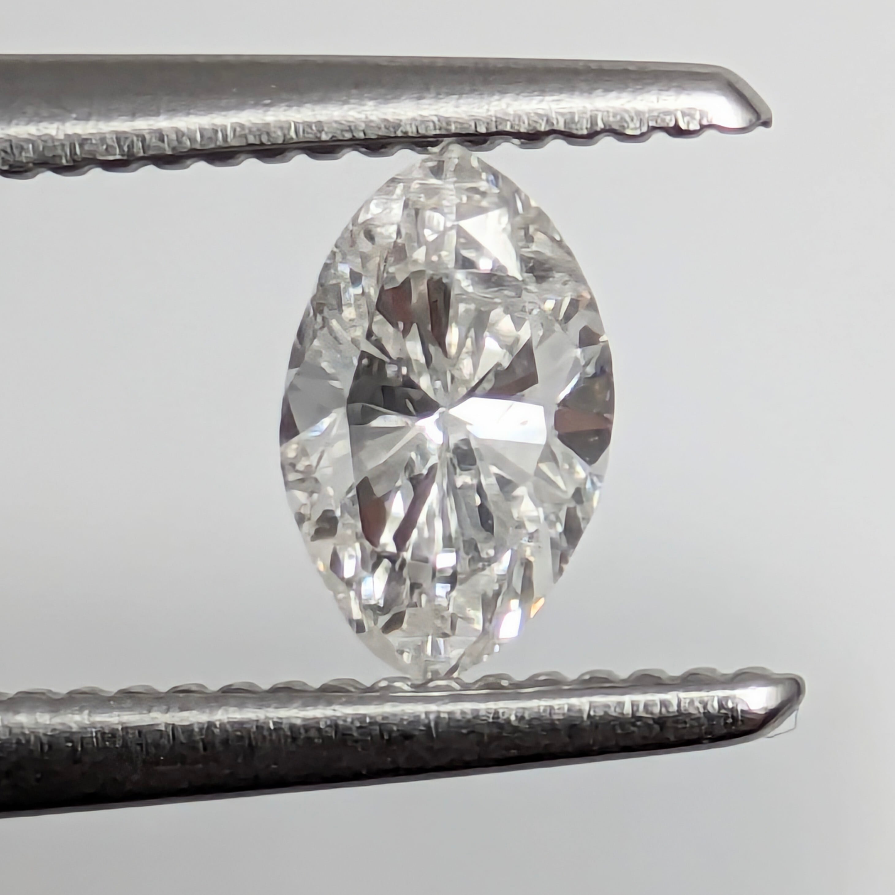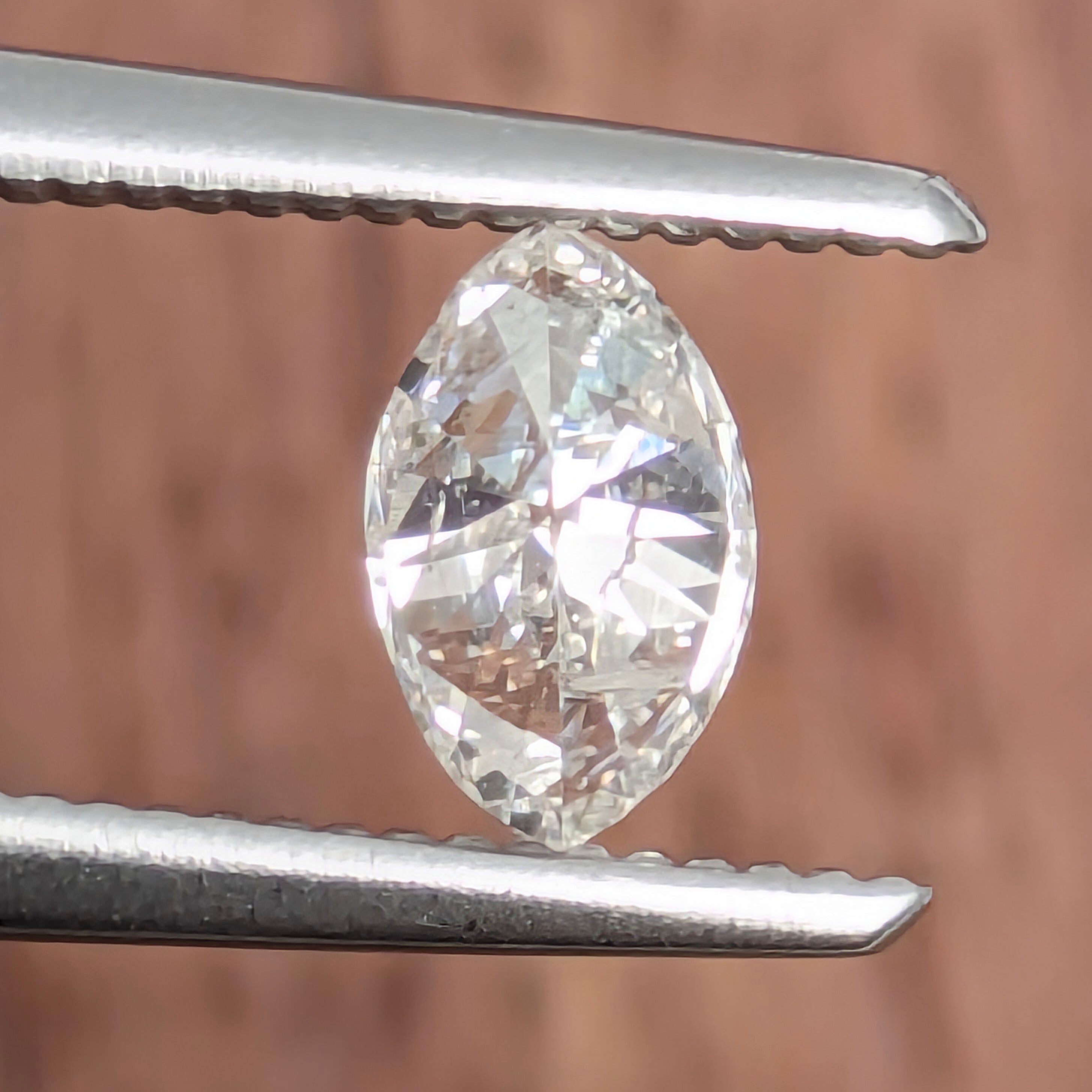 限りなく無色に近い透明感と、ちょっと気取ったような洗練された輝きを楽しめる1ピース。黒色のカーボンを含んだフェザー状のインクルージョンも肉眼ではほとんど気になりません。マーキスカットならではの、ラウンドとは一味違う輝きをお楽しみください!