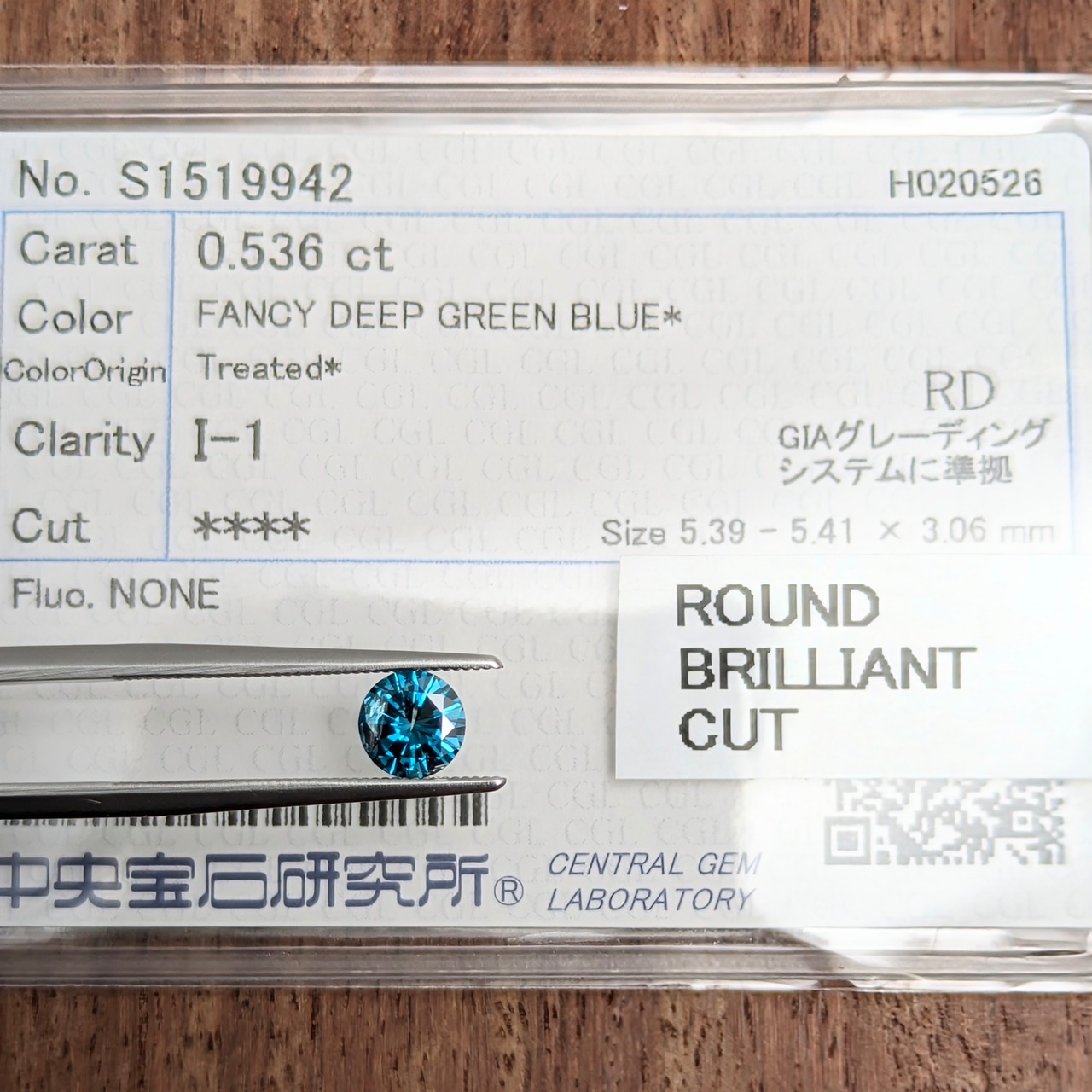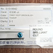付属品:FANCY DEEP GREEN BLUE(Treated) I1 ROUND BRILLIANT CUT 中宝研ソーティング