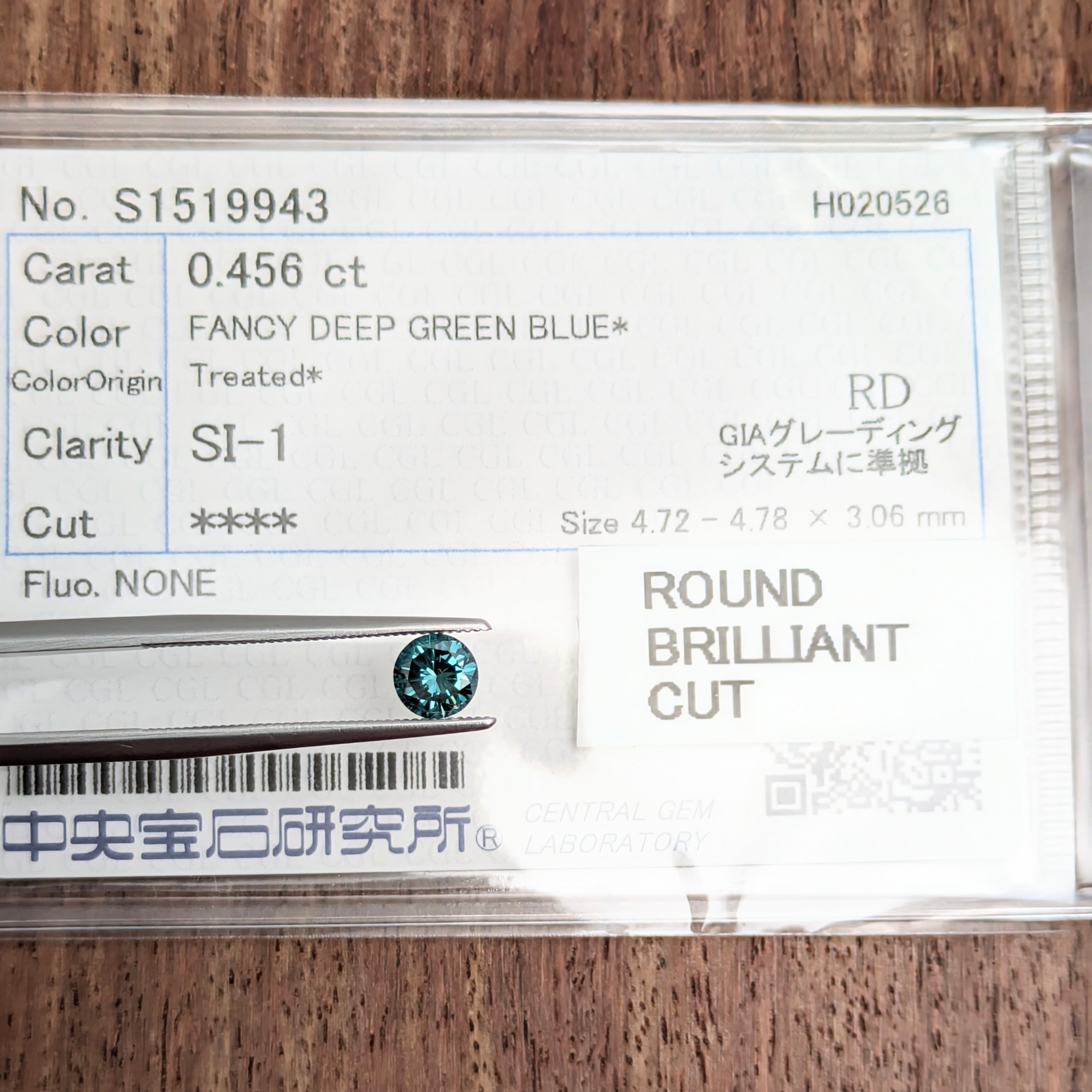 付属品:FANCY DEEP GREEN BLUE(Treated) SI1 ROUND BRILLIANT CUT 中宝研ソーティング