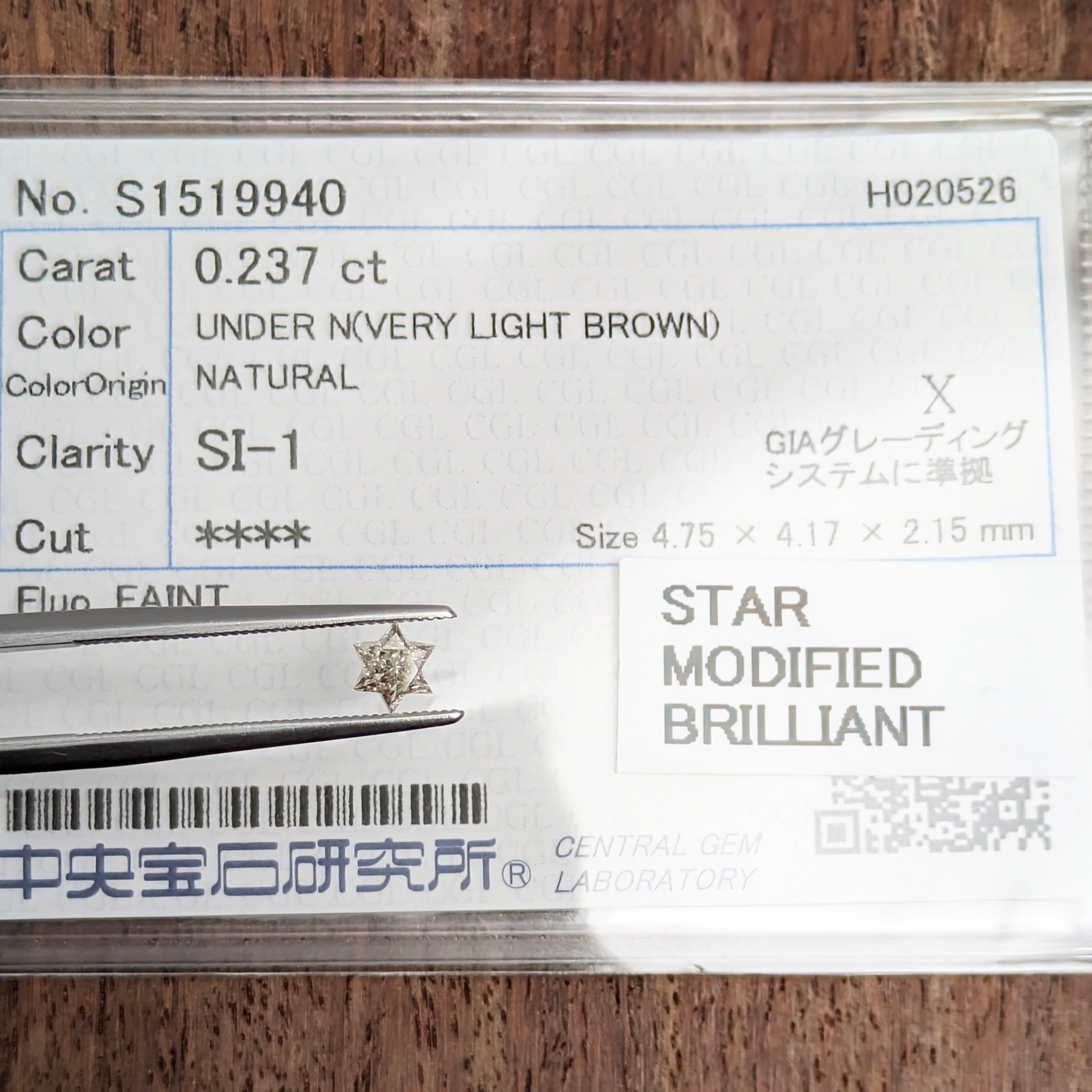 付属品:VERY LIGHT BROWN SI1 STAR MODIFIED BRILLIANT 中宝研ソーティング
