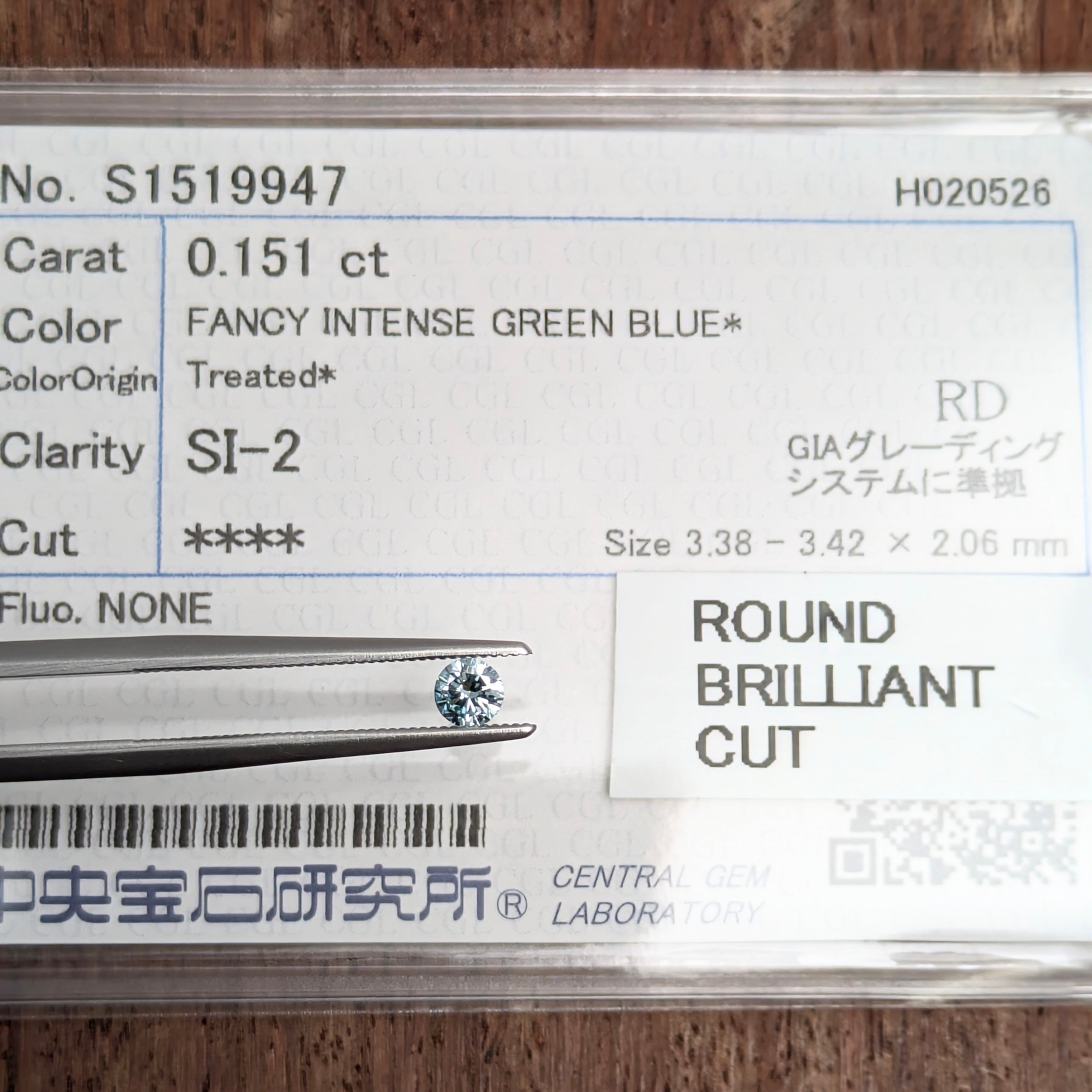 付属品:FANCY INTENSE GREEN BLUE(Treated) SI2 ROUND BRILLIANT CUT 中宝研ソーティング