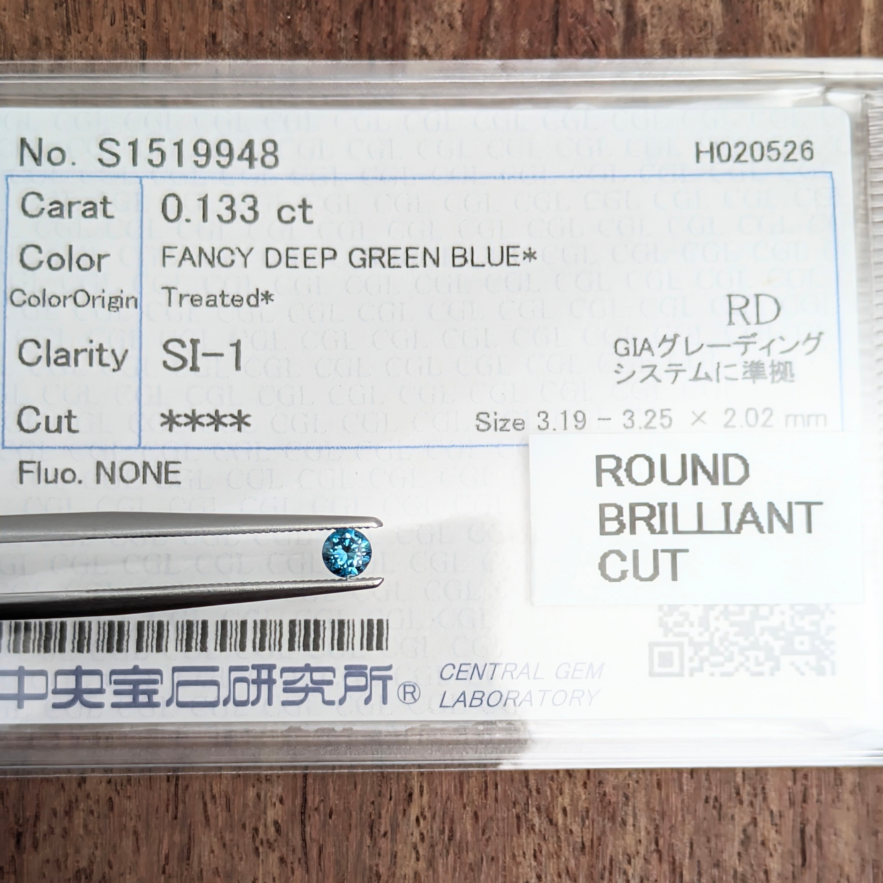 付属品:FANCY DEEP GREEN BLUE(Treated) SI1 ROUND BRILLIANT CUT 中宝研ソーティング