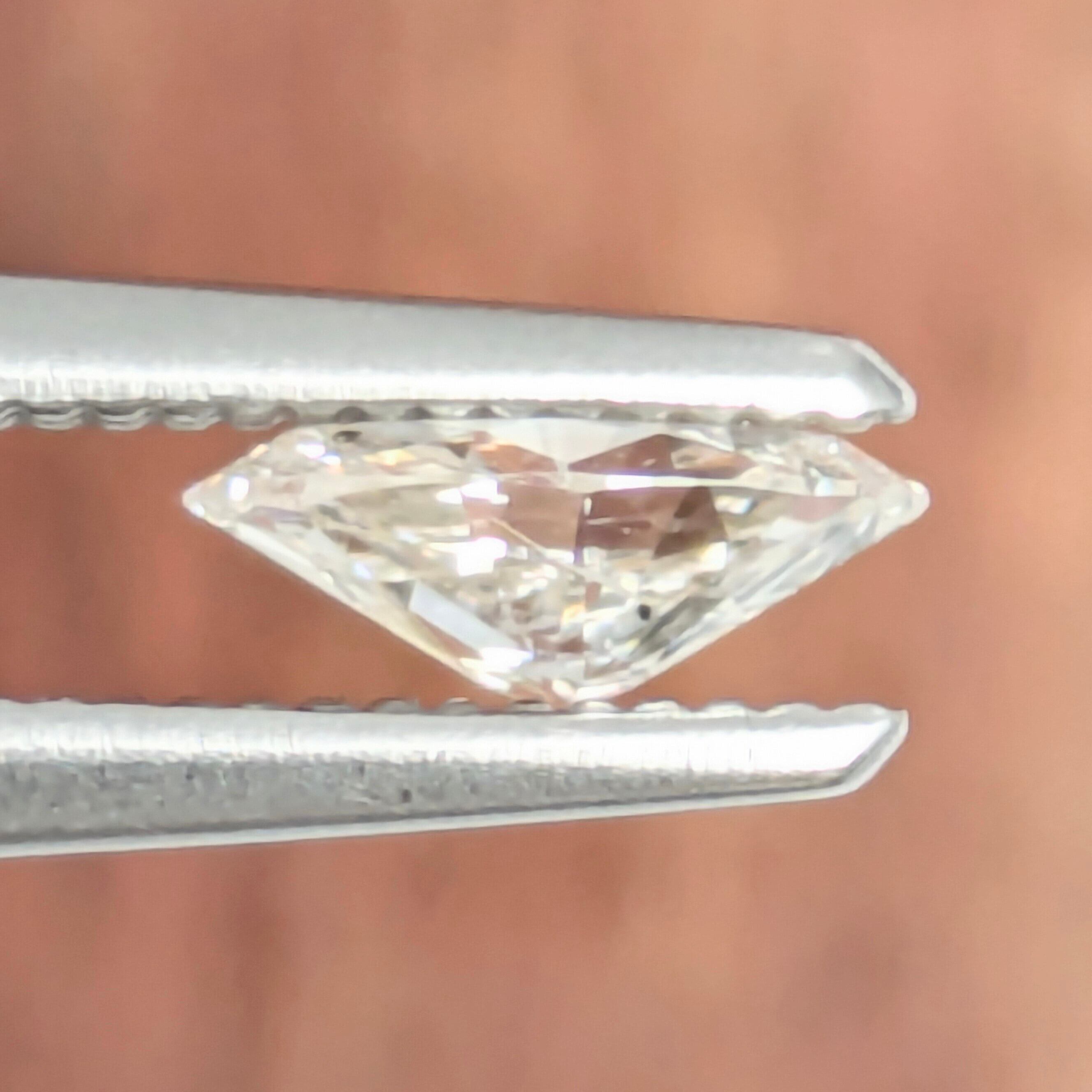 氷の世界の木の葉のような、鋭利な輝きと美しさが魅力的なマーキスカットのダイヤモンド。形の性質として、ラウンドブリリアントカットよりも面が大きく、ボリューム感を楽しめる点もメリットです。今回は、端の方に透明系のフェザーとカーボンが入っているSI-2ですが、マーキスカット特有の狭い幅の中に施される細かいカット面からの光の反射の煌めきで、全くインクルージョンも気になりません。輝きの強い、美しい1ピースです。