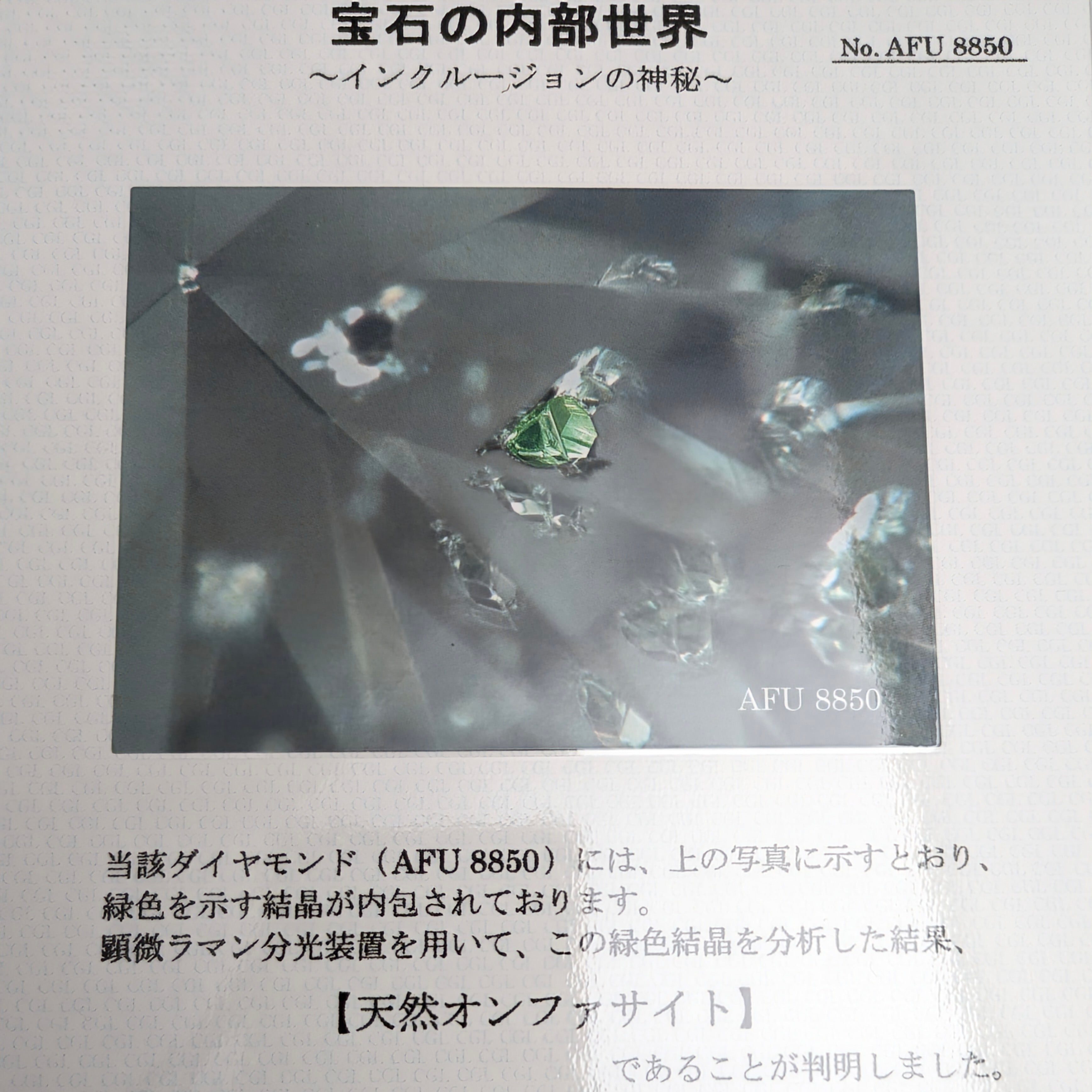 美しいグリーンの結晶が、万華鏡のように石の内部に反射して煌めくダイヤモンド。このグリーンの結晶の正体は「オンファサイト」という他鉱物で、いわゆる翡翠/ヒスイと同じ輝石グループの宝石です。宝石にとってのインクルージョンは、その美しさを損なう場合はマイナスのイメージがありますが、美しい【色】を持ったまま閉じ込められたその幽閉されたプリンセスのような姿は、コレクターの心を揺さぶってなりません。ルーペでも十分その姿を確認できますが、美しくその姿を捉えた鑑定書のお写真も併せて、お楽しみください。