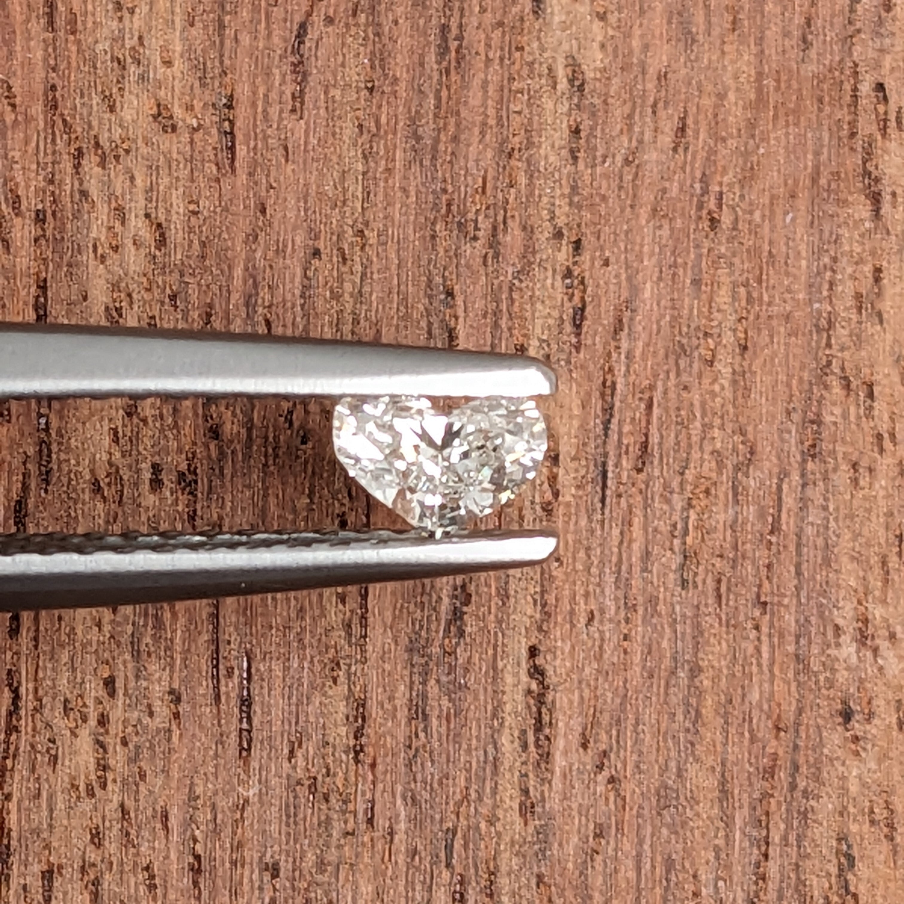 思い切り横長に広がったとってもキュートなハートシェイプのダイヤモンドです。まるでにっこりとほほ笑んだ口元のような、柔らかな曲線が思わずこちらにも笑みが浮かんでしまう1ピース。「SI-2」というグレードですがテーブル内は非常にクリアで、メインのインクルージョンは尖り部分にちょっと含まれる黒色の内包物。肉眼では気になりませんし、枠に留めたら全く見えなくなる理想的な位置です。甘々の、ちょっと個性的なハートをお探しの方にお勧め。